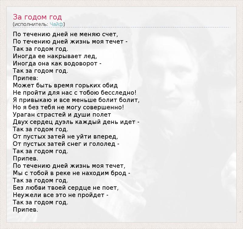 По течению дней не меняю счет, По течению дней жизнь моя течет - Так за годом год. Иногда ее накрывает лед, Иногда она как водоворот - Так за годом год. Припев: Может быть время горьких обид Не пройти для нас с тобою бесследно! Я привыкаю и все меньше болит болит, Но я без тебя не могу совершенно! Ураган страстей и души полет Двух сердец дуэль каждый день идет - Так за годом год. От пустых затей не уйти вперед, От пустых затей снег и гололед - Так за годом год. Припев. По течению дней жизнь моя течет, Мы с тобой в реке не находим брод - Так за годом год. Без любви твоей сердце не поет, Неужели все это не пройдет - Так за годом год. Припев.