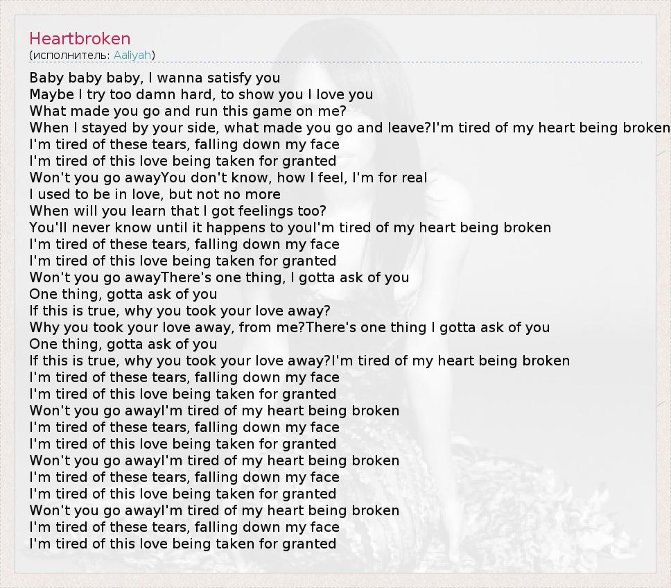 Baby baby baby, I wanna satisfy you Maybe I try too damn hard, to show you I love you What made you go and run this game on me? When I stayed by your side, what made you go and leave?I'm tired of my heart being broken I'm tired of these tears, falling down my face I'm tired of this love being taken for granted Won't you go awayYou don't know, how I feel, I'm for real I used to be in love, but not no more When will you learn that I got feelings too? You'll never know until it happens to youI'm tired of my heart being broken I'm tired of these tears, falling down my face I'm tired of this love being taken for granted Won't you go awayThere's one thing, I gotta ask of you One thing, gotta ask of you If this is true, why you took your love away? Why you took your love away, from me?There's one thing I gotta ask of you One thing, gotta ask of you If this is true, why you took your love away?I'm tired of my heart being broken I'm tired of these tears, falling down my face I'm tired of this love being taken for granted Won't you go awayI'm tired of my heart being broken I'm tired of these tears, falling down my face I'm tired of this love being taken for granted Won't you go awayI'm tired of my heart being broken I'm tired of these tears, falling down my face I'm tired of this love being taken for granted Won't you go awayI'm tired of my heart being broken I'm tired of these tears, falling down my face I'm tired of this love being taken for granted