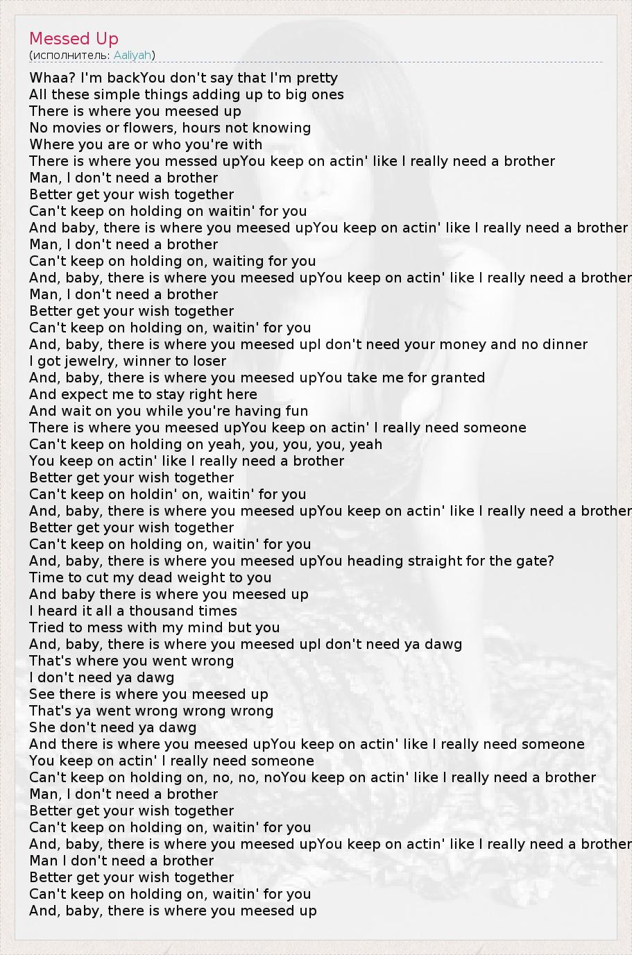 Whaa? I'm backYou don't say that I'm pretty All these simple things adding up to big ones There is where you meesed up No movies or flowers, hours not knowing Where you are or who you're with There is where you messed upYou keep on actin' like I really need a brother Man, I don't need a brother Better get your wish together Can't keep on holding on waitin' for you And baby, there is where you meesed upYou keep on actin' like I really need a brother Man, I don't need a brother Can't keep on holding on, waiting for you And, baby, there is where you meesed upYou keep on actin' like I really need a brother Man, I don't need a brother Better get your wish together Can't keep on holding on, waitin' for you And, baby, there is where you meesed upI don't need your money and no dinner I got jewelry, winner to loser And, baby, there is where you meesed upYou take me for granted And expect me to stay right here And wait on you while you're having fun There is where you meesed upYou keep on actin' I really need someone Can't keep on holding on yeah, you, you, you, yeah You keep on actin' like I really need a brother Better get your wish together Can't keep on holdin' on, waitin' for you And, baby, there is where you meesed upYou keep on actin' like I really need a brother Better get your wish together Can't keep on holding on, waitin' for you And, baby, there is where you meesed upYou heading straight for the gate? Time to cut my dead weight to you And baby there is where you meesed up I heard it all a thousand times Tried to mess with my mind but you And, baby, there is where you meesed upI don't need ya dawg That's where you went wrong I don't need ya dawg See there is where you meesed up That's ya went wrong wrong wrong She don't need ya dawg And there is where you meesed upYou keep on actin' like I really need someone You keep on actin' I really need someone Can't keep on holding on, no, no, noYou keep on actin' like I really need a brother Man, I don't need a brother Better get your wish together Can't keep on holding on, waitin' for you And, baby, there is where you meesed upYou keep on actin' like I really need a brother Man I don't need a brother Better get your wish together Can't keep on holding on, waitin' for you And, baby, there is where you meesed up