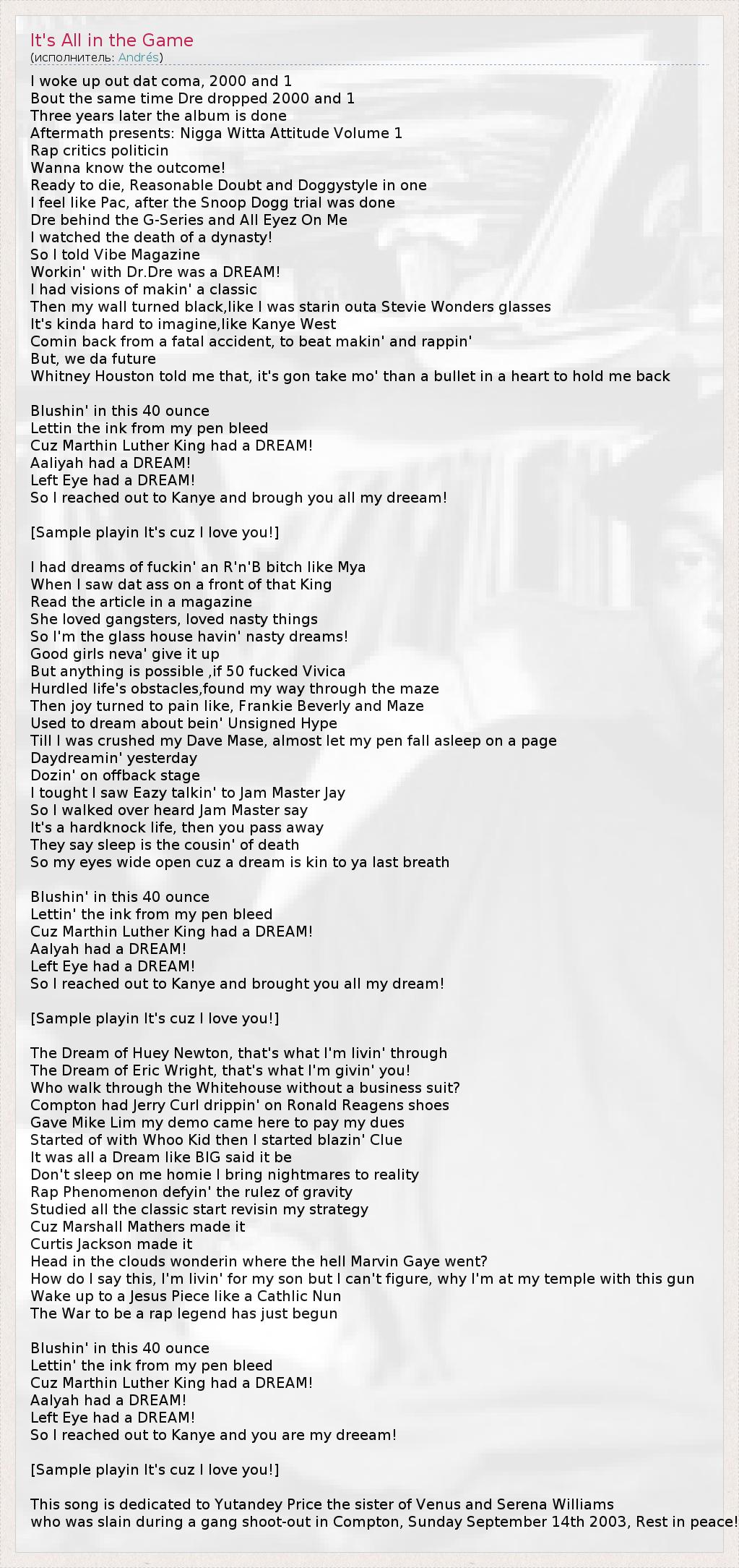 This song is dedicated to Yutandey Price the sister of Venus and Serena Williams