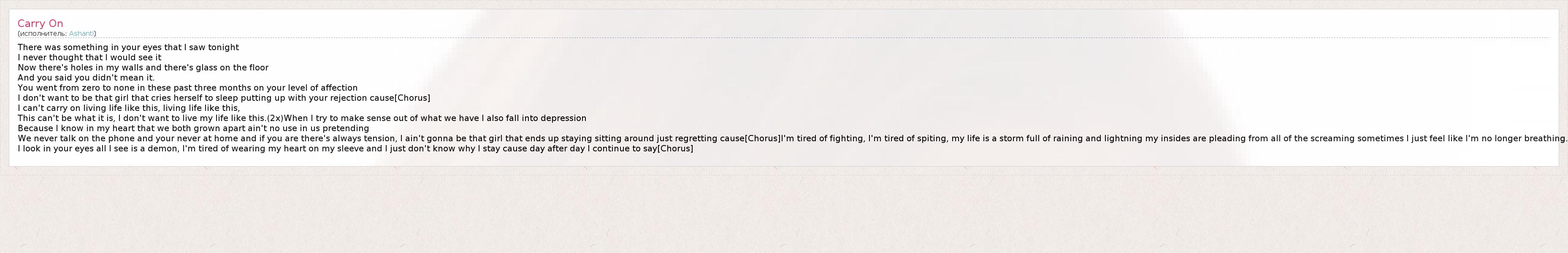 There was something in your eyes that I saw tonight I never thought that I would see it Now there's holes in my walls and there's glass on the floor And you said you didn't mean it. You went from zero to none in these past three months on your level of affection I don't want to be that girl that cries herself to sleep putting up with your rejection cause[Chorus] I can't carry on living life like this, living life like this, This can't be what it is, I don't want to live my life like this.(2x)When I try to make sense out of what we have I also fall into depression Because I know in my heart that we both grown apart ain't no use in us pretending We never talk on the phone and your never at home and if you are there's always tension, I ain't gonna be that girl that ends up staying sitting around just regretting cause[Chorus]I'm tired of fighting, I'm tired of spiting, my life is a storm full of raining and lightning my insides are pleading from all of the screaming sometimes I just feel like I'm no longer breathing. I look in your eyes all I see is a demon, I'm tired of wearing my heart on my sleeve and I just don't know why I stay cause day after day I continue to say[Chorus]