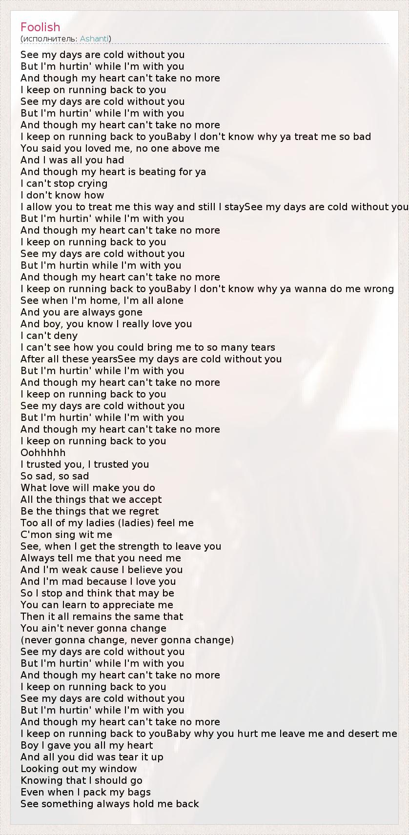 See my days are cold without you But I'm hurtin' while I'm with you And though my heart can't take no more I keep on running back to you See my days are cold without you But I'm hurtin' while I'm with you And though my heart can't take no more I keep on running back to youBaby I don't know why ya treat me so bad You said you loved me, no one above me And I was all you had And though my heart is beating for ya I can't stop crying I don't know how I allow you to treat me this way and still I staySee my days are cold without you But I'm hurtin' while I'm with you And though my heart can't take no more I keep on running back to you See my days are cold without you But I'm hurtin while I'm with you And though my heart can't take no more I keep on running back to youBaby I don't know why ya wanna do me wrong See when I'm home, I'm all alone And you are always gone And boy, you know I really love you I can't deny I can't see how you could bring me to so many tears After all these yearsSee my days are cold without you But I'm hurtin' while I'm with you And though my heart can't take no more I keep on running back to you See my days are cold without you But I'm hurtin' while I'm with you And though my heart can't take no more I keep on running back to you Oohhhhh I trusted you, I trusted you So sad, so sad What love will make you do All the things that we accept Be the things that we regret Too all of my ladies (ladies) feel me C'mon sing wit me See, when I get the strength to leave you Always tell me that you need me And I'm weak cause I believe you And I'm mad because I love you So I stop and think that may be You can learn to appreciate me Then it all remains the same that You ain't never gonna change (never gonna change, never gonna change) See my days are cold without you But I'm hurtin' while I'm with you And though my heart can't take no more I keep on running back to you See my days are cold without you But I'm hurtin' while I'm with you And though my heart can't take no more I keep on running back to youBaby why you hurt me leave me and desert me Boy I gave you all my heart And all you did was tear it up Looking out my window Knowing that I should go Even when I pack my bags See something always hold me back