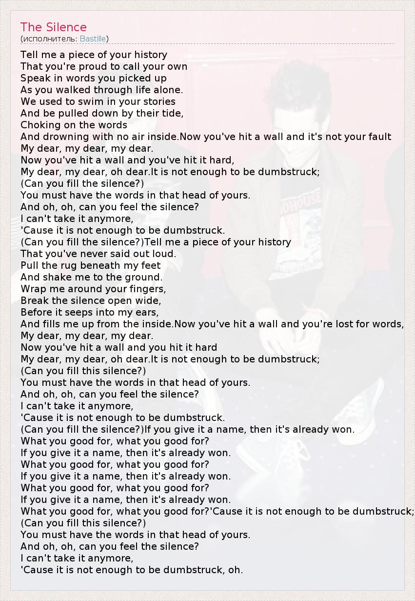 Tell me a piece of your history That you're proud to call your own Speak in words you picked up As you walked through life alone. We used to swim in your stories And be pulled down by their tide, Choking on the words And drowning with no air inside.Now you've hit a wall and it's not your fault My dear, my dear, my dear. Now you've hit a wall and you've hit it hard, My dear, my dear, oh dear.It is not enough to be dumbstruck; (Can you fill the silence?) You must have the words in that head of yours. And oh, oh, can you feel the silence? I can't take it anymore, 'Cause it is not enough to be dumbstruck. (Can you fill the silence?)Tell me a piece of your history That you've never said out loud. Pull the rug beneath my feet And shake me to the ground. Wrap me around your fingers, Break the silence open wide, Before it seeps into my ears, And fills me up from the inside.Now you've hit a wall and you're lost for words, My dear, my dear, my dear. Now you've hit a wall and you hit it hard My dear, my dear, oh dear.It is not enough to be dumbstruck; (Can you fill this silence?) You must have the words in that head of yours. And oh, oh, can you feel the silence? I can't take it anymore, 'Cause it is not enough to be dumbstruck. (Can you fill the silence?)If you give it a name, then it's already won. What you good for, what you good for? If you give it a name, then it's already won. What you good for, what you good for? If you give it a name, then it's already won. What you good for, what you good for? If you give it a name, then it's already won. What you good for, what you good for?'Cause it is not enough to be dumbstruck; (Can you fill this silence?) You must have the words in that head of yours. And oh, oh, can you feel the silence? I can't take it anymore, 'Cause it is not enough to be dumbstruck, oh.