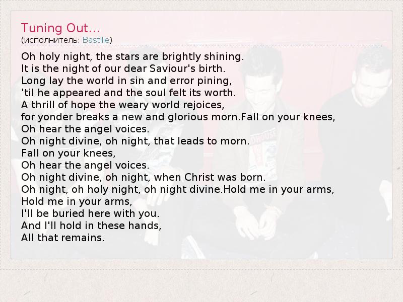Oh night, oh holy night, oh night divine.Hold me in your arms,