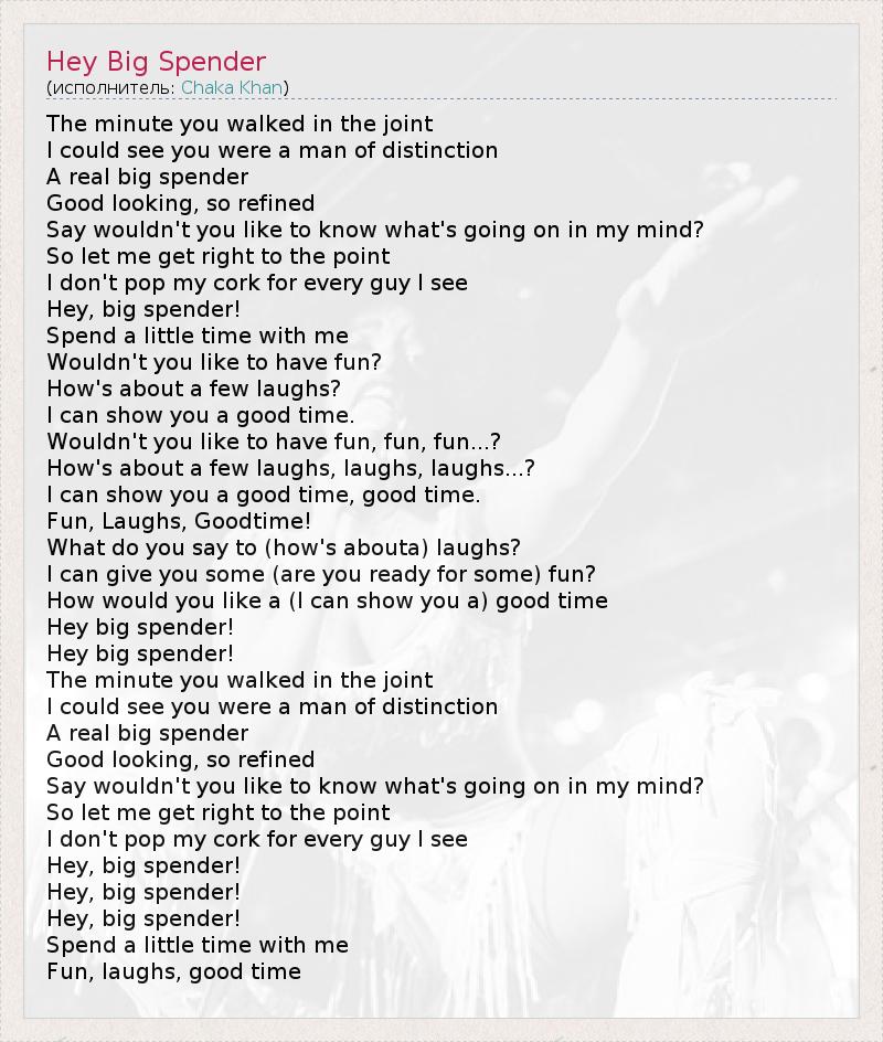 The minute you walked in the joint I could see you were a man of distinction A real big spender Good looking, so refined Say wouldn't you like to know what's going on in my mind? So let me get right to the point I don't pop my cork for every guy I see Hey, big spender! Spend a little time with me Wouldn't you like to have fun? How's about a few laughs? I can show you a good time. Wouldn't you like to have fun, fun, fun...? How's about a few laughs, laughs, laughs...? I can show you a good time, good time. Fun, Laughs, Goodtime! What do you say to (how's abouta) laughs? I can give you some (are you ready for some) fun? How would you like a (I can show you a) good time Hey big spender! Hey big spender! The minute you walked in the joint I could see you were a man of distinction A real big spender Good looking, so refined Say wouldn't you like to know what's going on in my mind? So let me get right to the point I don't pop my cork for every guy I see Hey, big spender! Hey, big spender! Hey, big spender! Spend a little time with me Fun, laughs, good time