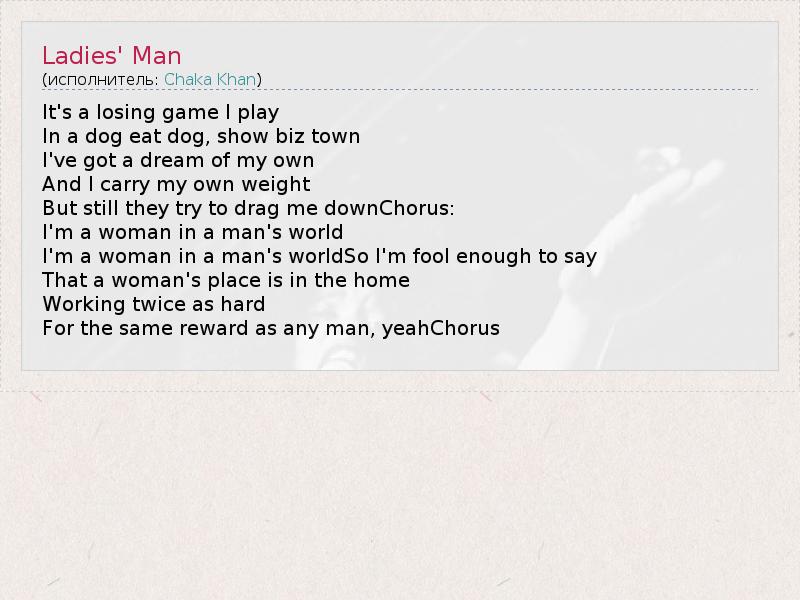 It's a losing game I play In a dog eat dog, show biz town I've got a dream of my own And I carry my own weight But still they try to drag me downChorus: I'm a woman in a man's world I'm a woman in a man's worldSo I'm fool enough to say That a woman's place is in the home Working twice as hard For the same reward as any man, yeahChorus