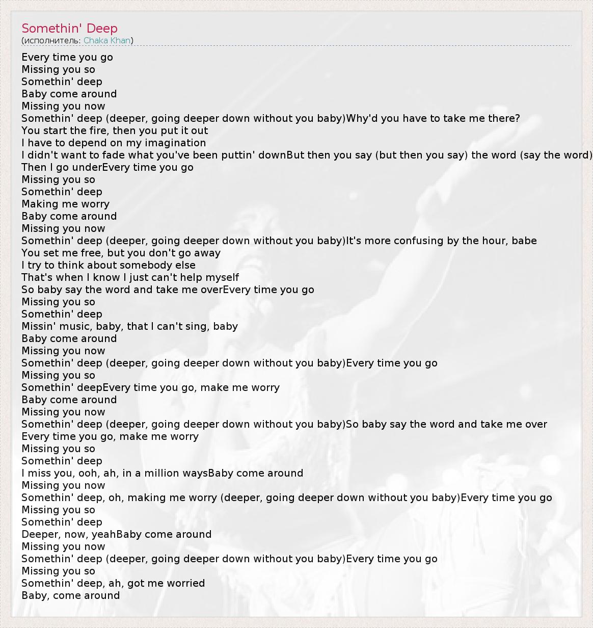 Somethin' deep, oh, making me worry (deeper, going deeper down without you baby)Every time you go