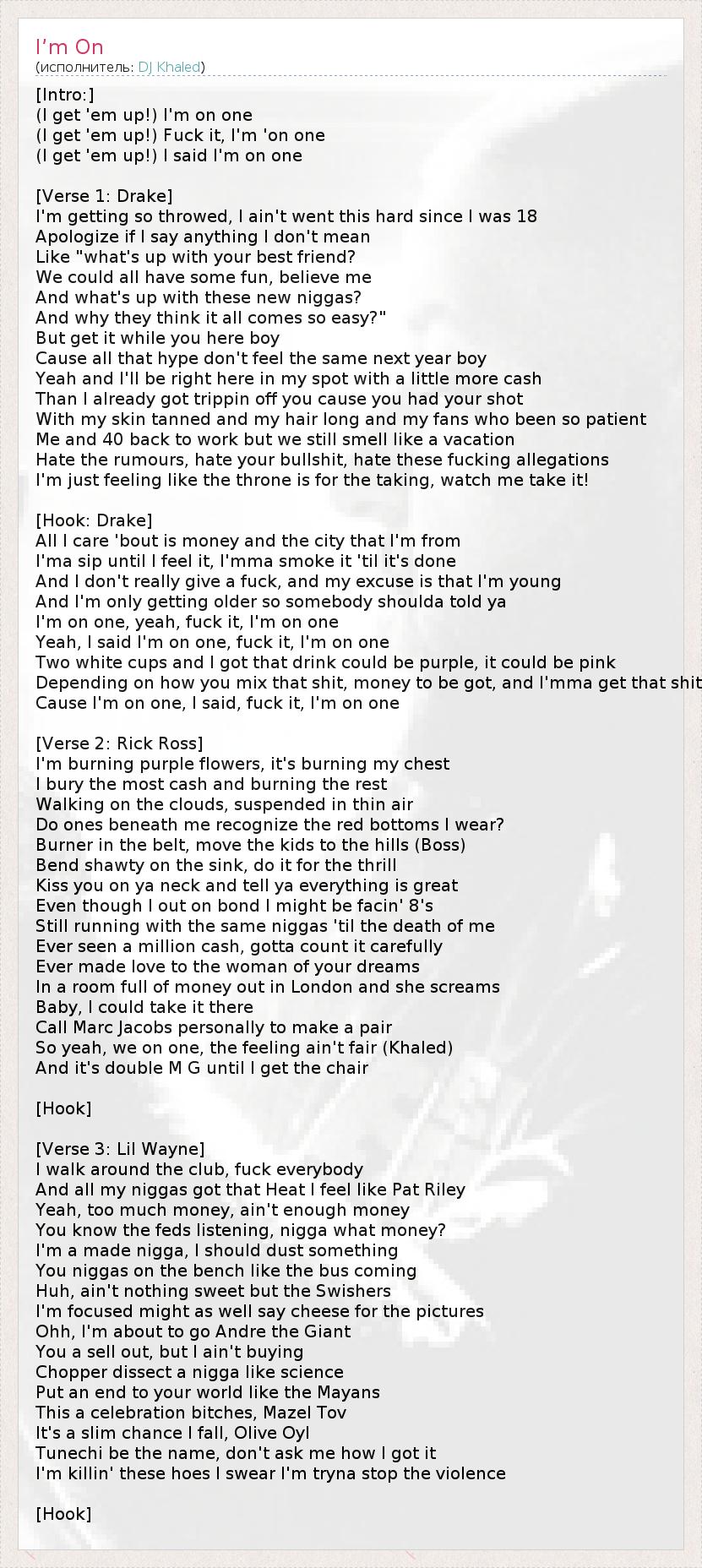 Это интересно:Dj Khaled родился в Новом Орлеане, штат Луизиана . Он имеет палестинские корни и живет в Пемброк Пайнс Ознакомившись с треклистами двух альбомов DJ Khaled, есть риск поймать себя на желании навесить на него ярлык главного жулика и халявщика современного хип-хопа" - на обеих пластинках всего 3 песни с его продакшном. При этом он не читает рэп и не поет – впору трясти чеком и требовать сатисфакции.... продолжение