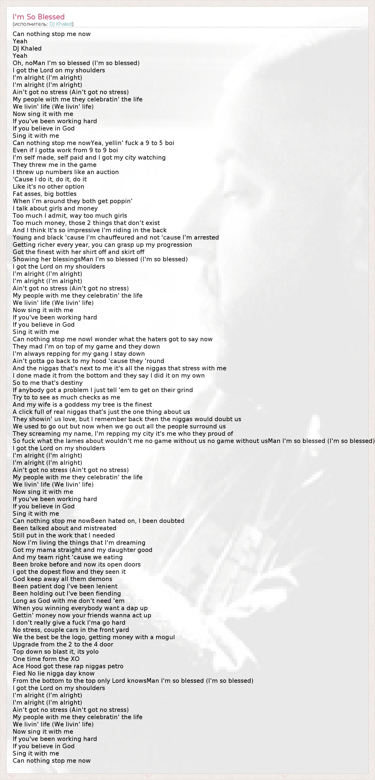 Can nothing stop me now Yeah DJ Khaled Yeah Oh, noMan I'm so blessed (I'm so blessed) I got the Lord on my shoulders I'm alright (I'm alright) I'm alright (I'm alright) Ain't got no stress (Ain't got no stress) My people with me they celebratin' the life We livin' life (We livin' life) Now sing it with me If you've been working hard If you believe in God Sing it with me Can nothing stop me nowYea, yellin' fuck a 9 to 5 boi Even if I gotta work from 9 to 9 boi I'm self made, self paid and I got my city watching They threw me in the game I threw up numbers like an auction 'Cause I do it, do it, do it Like it's no other option Fat asses, big bottles When I'm around they both get poppin' I talk about girls and money Too much I admit, way too much girls Too much money, those 2 things that don't exist And I think It's so impressive I'm riding in the back Young and black 'cause I'm chauffeured and not 'cause I'm arrested Getting richer every year, you can grasp up my progression Got the finest with her shirt off and skirt off Showing her blessingsMan I'm so blessed (I'm so blessed) I got the Lord on my shoulders I'm alright (I'm alright) I'm alright (I'm alright) Ain't got no stress (Ain't got no stress) My people with me they celebratin' the life We livin' life (We livin' life) Now sing it with me If you've been working hard If you believe in God Sing it with me Can nothing stop me nowI wonder what the haters got to say now They mad I'm on top of my game and they down I'm always repping for my gang I stay down Ain't gotta go back to my hood 'cause they 'round And the niggas that's next to me it's all the niggas that stress with me I done made it from the bottom and they say I did it on my own So to me that's destiny If anybody got a problem I just tell 'em to get on their grind Try to to see as much checks as me And my wife is a goddess my tree is the finest A click full of real niggas that's just the one thing about us They showin' us love, but I remember back then the niggas would doubt us We used to go out but now when we go out all the people surround us They screaming my name, I'm repping my city it's me who they proud of So fuck what the lames about wouldn't me no game without us no game without usMan I'm so blessed (I'm so blessed) I got the Lord on my shoulders I'm alright (I'm alright) I'm alright (I'm alright) Ain't got no stress (Ain't got no stress) My people with me they celebratin' the life We livin' life (We livin' life) Now sing it with me If you've been working hard If you believe in God Sing it with me Can nothing stop me nowBeen hated on, I been doubted Been talked about and mistreated Still put in the work that I needed Now I'm living the things that I'm dreaming Got my mama straight and my daughter good And my team right 'cause we eating Been broke before and now its open doors I got the dopest flow and they seen it God keep away all them demons Been patient dog I've been lenient Been holding out I've been fiending Long as God with me don't need 'em When you winning everybody want a dap up Gettin' money now your friends wanna act up I don't really give a fuck I'ma go hard No stress, couple cars in the front yard We the best be the logo, getting money with a mogul Upgrade from the 2 to the 4 door Top down so blast it, its yolo One time form the XO Ace Hood got these rap niggas petro Fied No lie nigga day know From the bottom to the top only Lord knowsMan I'm so blessed (I'm so blessed) I got the Lord on my shoulders I'm alright (I'm alright) I'm alright (I'm alright) Ain't got no stress (Ain't got no stress) My people with me they celebratin' the life We livin' life (We livin' life) Now sing it with me If you've been working hard If you believe in God Sing it with me Can nothing stop me now