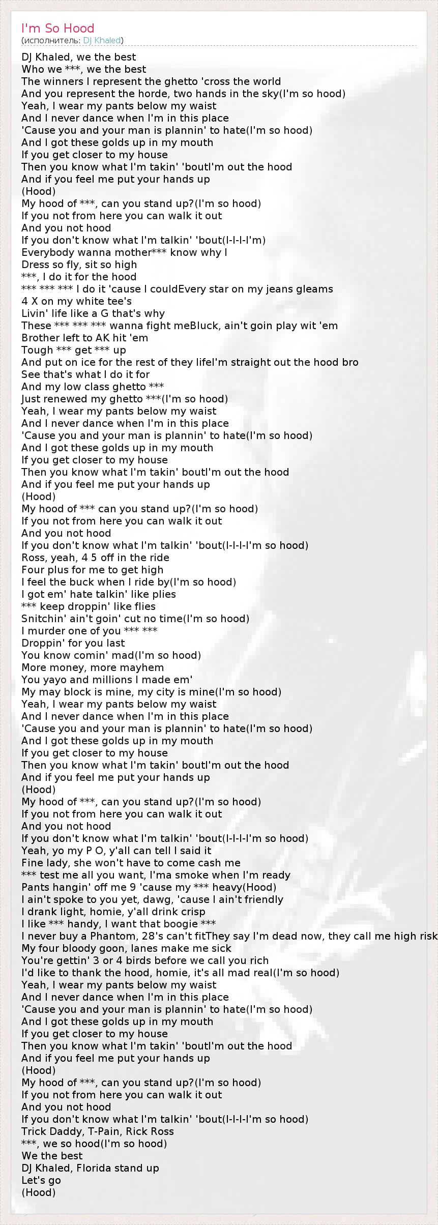 DJ Khaled, we the best Who we ***, we the best The winners I represent the ghetto 'cross the world And you represent the horde, two hands in the sky(I'm so hood) Yeah, I wear my pants below my waist And I never dance when I'm in this place 'Cause you and your man is plannin' to hate(I'm so hood) And I got these golds up in my mouth If you get closer to my house Then you know what I'm takin' 'boutI'm out the hood And if you feel me put your hands up (Hood) My hood of ***, can you stand up?(I'm so hood) If you not from here you can walk it out And you not hood If you don't know what I'm talkin' 'bout(I-I-I-I'm) Everybody wanna mother*** know why I Dress so fly, sit so high ***, I do it for the hood *** *** *** I do it 'cause I couldEvery star on my jeans gleams 4 X on my white tee's Livin' life like a G that's why These *** *** *** wanna fight meBluck, ain't goin play wit 'em Brother left to AK hit 'em Tough *** get *** up And put on ice for the rest of they lifeI'm straight out the hood bro See that's what I do it for And my low class ghetto *** Just renewed my ghetto ***(I'm so hood) Yeah, I wear my pants below my waist And I never dance when I'm in this place 'Cause you and your man is plannin' to hate(I'm so hood) And I got these golds up in my mouth If you get closer to my house Then you know what I'm takin' boutI'm out the hood And if you feel me put your hands up (Hood) My hood of *** can you stand up?(I'm so hood) If you not from here you can walk it out And you not hood If you don't know what I'm talkin' 'bout(I-I-I-I'm so hood) Ross, yeah, 4 5 off in the ride Four plus for me to get high I feel the buck when I ride by(I'm so hood) I got em' hate talkin' like plies *** keep droppin' like flies Snitchin' ain't goin' cut no time(I'm so hood) I murder one of you *** *** Droppin' for you last You know comin' mad(I'm so hood) More money, more mayhem You yayo and millions I made em' My may block is mine, my city is mine(I'm so hood) Yeah, I wear my pants below my waist And I never dance when I'm in this place 'Cause you and your man is plannin' to hate(I'm so hood) And I got these golds up in my mouth If you get closer to my house Then you know what I'm takin' boutI'm out the hood And if you feel me put your hands up (Hood) My hood of ***, can you stand up?(I'm so hood) If you not from here you can walk it out And you not hood If you don't know what I'm talkin' 'bout(I-I-I-I'm so hood) Yeah, yo my P O, y'all can tell I said it Fine lady, she won't have to come cash me *** test me all you want, I'ma smoke when I'm ready Pants hangin' off me 9 'cause my *** heavy(Hood) I ain't spoke to you yet, dawg, 'cause I ain't friendly I drank light, homie, y'all drink crisp I like *** handy, I want that boogie *** I never buy a Phantom, 28's can't fitThey say I'm dead now, they call me high risk My four bloody goon, lanes make me sick You're gettin' 3 or 4 birds before we call you rich I'd like to thank the hood, homie, it's all mad real(I'm so hood) Yeah, I wear my pants below my waist And I never dance when I'm in this place 'Cause you and your man is plannin' to hate(I'm so hood) And I got these golds up in my mouth If you get closer to my house Then you know what I'm takin' 'boutI'm out the hood And if you feel me put your hands up (Hood) My hood of ***, can you stand up?(I'm so hood) If you not from here you can walk it out And you not hood If you don't know what I'm talkin' 'bout(I-I-I-I'm so hood) Trick Daddy, T-Pain, Rick Ross ***, we so hood(I'm so hood) We the best DJ Khaled, Florida stand up Let's go (Hood)