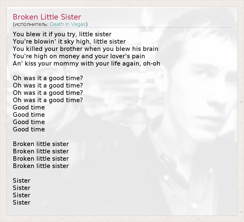 You blew it if you try, little sister You're blowin' it sky high, little sister You killed your brother when you blew his brain You're high on money and your lover's pain An' kiss your mommy with your life again, oh-oh Oh was it a good time? Oh was it a good time? Oh was it a good time? Oh was it a good time? Good time Good time Good time Good time Broken little sister Broken little sister Broken little sister Broken little sister Sister Sister Sister Sister
