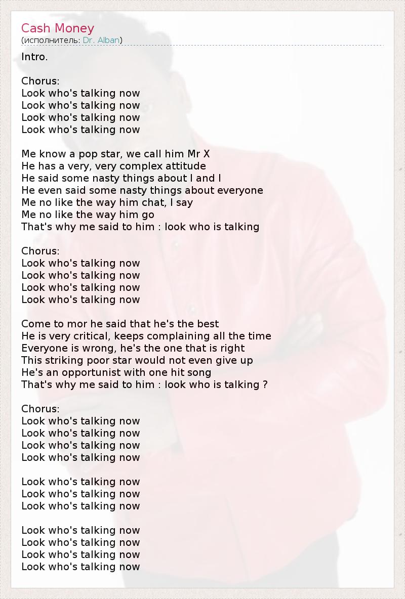 Intro. Chorus: Look who's talking now Look who's talking now Look who's talking now Look who's talking now Me know a pop star, we call him Mr X He has a very, very complex attitude He said some nasty things about I and I He even said some nasty things about everyone Me no like the way him chat, I say Me no like the way him go That's why me said to him : look who is talking Chorus: Look who's talking now Look who's talking now Look who's talking now Look who's talking now Come to mor he said that he's the best He is very critical, keeps complaining all the time Everyone is wrong, he's the one that is right This striking poor star would not even give up He's an opportunist with one hit song That's why me said to him : look who is talking ? Chorus: Look who's talking now Look who's talking now Look who's talking now Look who's talking now Look who's talking now Look who's talking now Look who's talking now Look who's talking now Look who's talking now Look who's talking now Look who's talking now