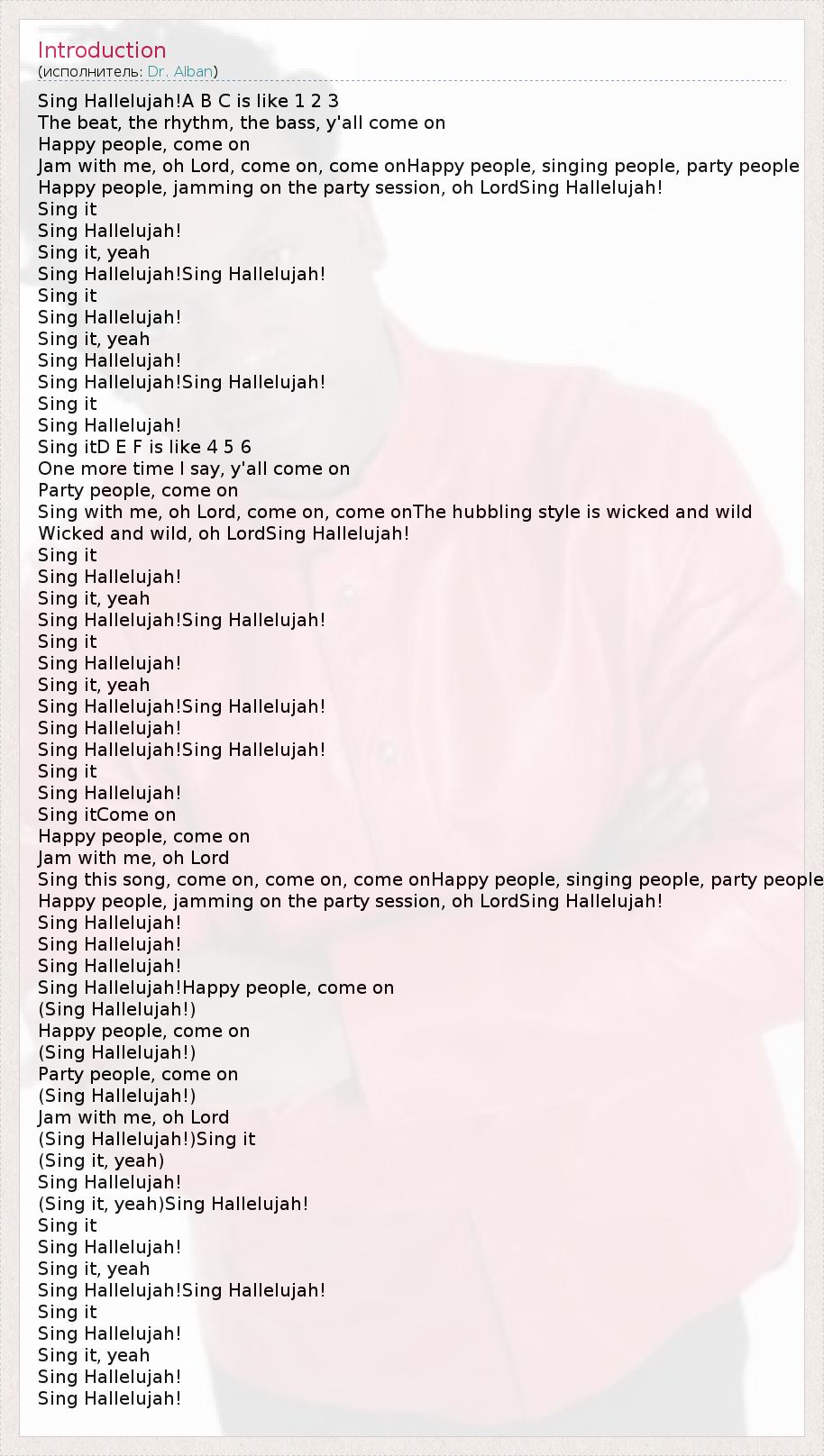Это интересно:Dr. Alban (родился 26 августа 1957 года в Нигерии Доктор Албан, настоящее имя Албан Нвапа) — шведский музыкант нигерийского происхождения, работающий в стиле Евродэнс, владелец собственного звукозаписывающего лейбла Dr-Records.Албан Нвапа начал профессионально заниматься музыкой в возрасте 23 лет. Нвапа не собирался становиться музыкантом, он учился в университете на дантиста.... продолжение