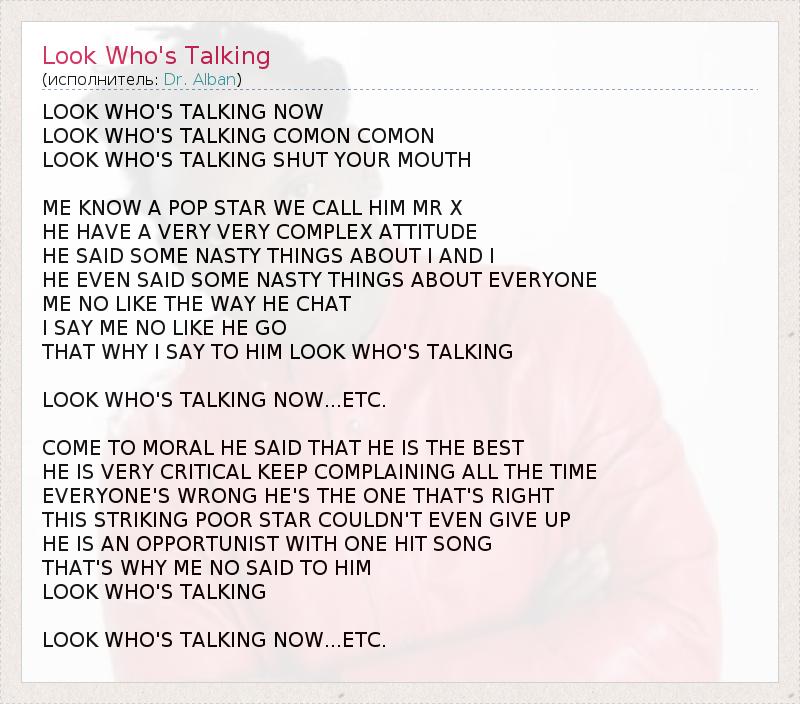 Посмотри, кто говорит сейчас, Посмотри, кто говорит: приходи ко мне, приходи ко мне Посмотри, кто говорит: закрой свой рот. Я знаю поп-звезду, я называю его мистер икс, Он имеет очень-очень сложные отношения, Он говорит какие-то гадости мне и обо мне, Он даже говорит какие-то гадости обо всех, Мне не нравятся его разговоры, Я говорю: мне не нравится его путь, Вот почему я говорю ему: посмотри, кто говорит. Посмотри, кто говорит сейчас… и т.д. Подойдем духовно: он сказал, что он лучший Он очень критически настроен, все время жалуется, Все заблуждаются, один он прав, Эта необыкновенная несчастная звезда не могла даже признать себя безнадежной, Он – лицемер с одной хитовой песней, Вот почему я сказал ему: Посмотри, кто говорит. Посмотри, кто говорит сейчас… и т.д.