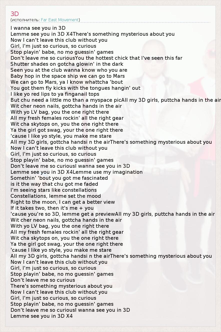 I wanna see you in 3D Lemme see you in 3D X4There's something mysterious about you Now I can't leave this club without you Girl, I'm just so curious, so curious Stop playin' babe, no mo guessin' games Don't leave me so curiousYou the hottest chick that I've seen this far Shutter shades on gotcha glowin' in the dark Seen you at the club wanna know who you are Baby hop in the space ship we can go to Mars We can go to Mars, ya I know whattcha 'bout You got them fly kicks with the tongues hangin' out I like yo red lips to ya finganail tops But chu need a little mo than a myspace picAll my 3D girls, puttcha hands in the air Wit cher neon nails, gottcha hands in the air With yo LV bag, you the one right there All my fresh females rockin' all the right gear Wit cha skytops on, you the one right there Ya the girl got swag, your the one right there 'cause I like yo style, you make me stare All my 3D girls, gottcha handsi n the airThere's something mysterious about you Now I can't leave this club without you Girl, I'm just so curious, so curious Stop playin' babe, no mo guessin' games Don't leave me so curiousI wanna see you in 3D Lemme see you in 3D X4Lemme use my imagination Somethin' 'bout you got me fascinated is it the way that chu got me faded I'm seeing stars like constellations Constellations, lemme set the mood Right to the moon, I can get a better view If it takes two, then it's me + you 'cause you're so 3D, lemme get a previewAll my 3D girls, puttcha hands in the air Wit cher neon nails, gottcha hands in the air With yo LV bag, you the one right there All my fresh females rockin' all the right gear Wit cha skytops on, you the one right there Ya the girl got swag, your the one right there 'cause I like yo style, you make me stare All my 3D girls, gottcha handsi n the airThere's something mysterious about you Now I can't leave this club without you Girl, I'm just so curious, so curious Stop playin' babe, no mo guessin' games Don't leave me so curious There's something mysterious about you Now I can't leave this club without you Girl, I'm just so curious, so curious Stop playin' babe, no mo guessin' games Don't leave me so curiousI wanna see you in 3D Lemme see you in 3D X4
