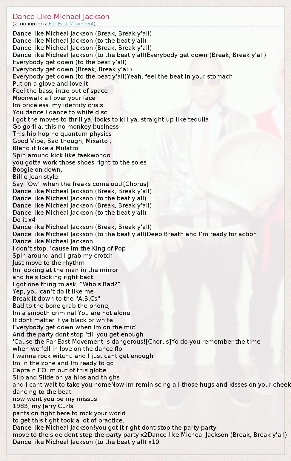 Dance like Micheal Jackson (Break, Break y'all) Dance like Micheal Jackson (to the beat y'all) Dance like Micheal Jackson (Break, Break y'all) Dance like Micheal Jackson (to the beat y'all)Everybody get down (Break, Break y'all) Everybody get down (to the beat y'all) Everybody get down (Break, Break y'all) Everybody get down (to the beat y'all)Yeah, feel the beat in your stomach Put on a glove and love it Feel the bass, intro out of space Moonwalk all over your face Im priceless, my identity crisis You dance I dance to white disc I got the moves to thrill ya, looks to kill ya, straight up like tequila Go gorilla, this no monkey business This hip hop no quantum physics Good Vibe, Bad though, Mixarto , Blend it like a Mulatto Spin around kick like taekwondo you gotta work those shoes right to the soles Boogie on down, Billie Jean style Say "Ow" when the freaks come out![Chorus] Dance like Micheal Jackson (Break, Break y'all) Dance like Micheal Jackson (to the beat y'all) Dance like Micheal Jackson (Break, Break y'all) Dance like Micheal Jackson (to the beat y'all) Do it x4 Dance like Micheal Jackson (Break, Break y'all) Dance like Micheal Jackson (to the beat y'all)Deep Breath and I'm ready for action Dance like Micheal Jackson I don't stop, 'cause Im the King of Pop Spin around and I grab my crotch Just move to the rhythm Im looking at the man in the mirror and he's looking right back I got one thing to ask, "Who's Bad?" Yep, you can't do it like me Break it down to the "A,B,Cs" Bad to the bone grab the phone, Im a smooth criminal You are not alone It dont matter if ya black or white Everybody get down when Im on the mic' And the party dont stop 'till you get enough 'Cause the Far East Movement is dangerous![Chorus]Yo do you remember the time when we fell in love on the dance flo' I wanna rock witchu and I just cant get enough Im in the zone and Im ready to go Captain EO Im out of this globe Slip and Slide on ya hips and thighs and I cant wait to take you homeNow Im reminiscing all those hugs and kisses on your cheek dancing to the beat now wont you be my missus 1983, my Jerry Curls pants on tight here to rock your world to get this tight took a lot of practice, Dance like Micheal Jackson!you got it right dont stop the party party move to the side dont stop the party party x2Dance like Micheal Jackson (Break, Break y'all) Dance like Micheal Jackson (to the beat y'all) x10