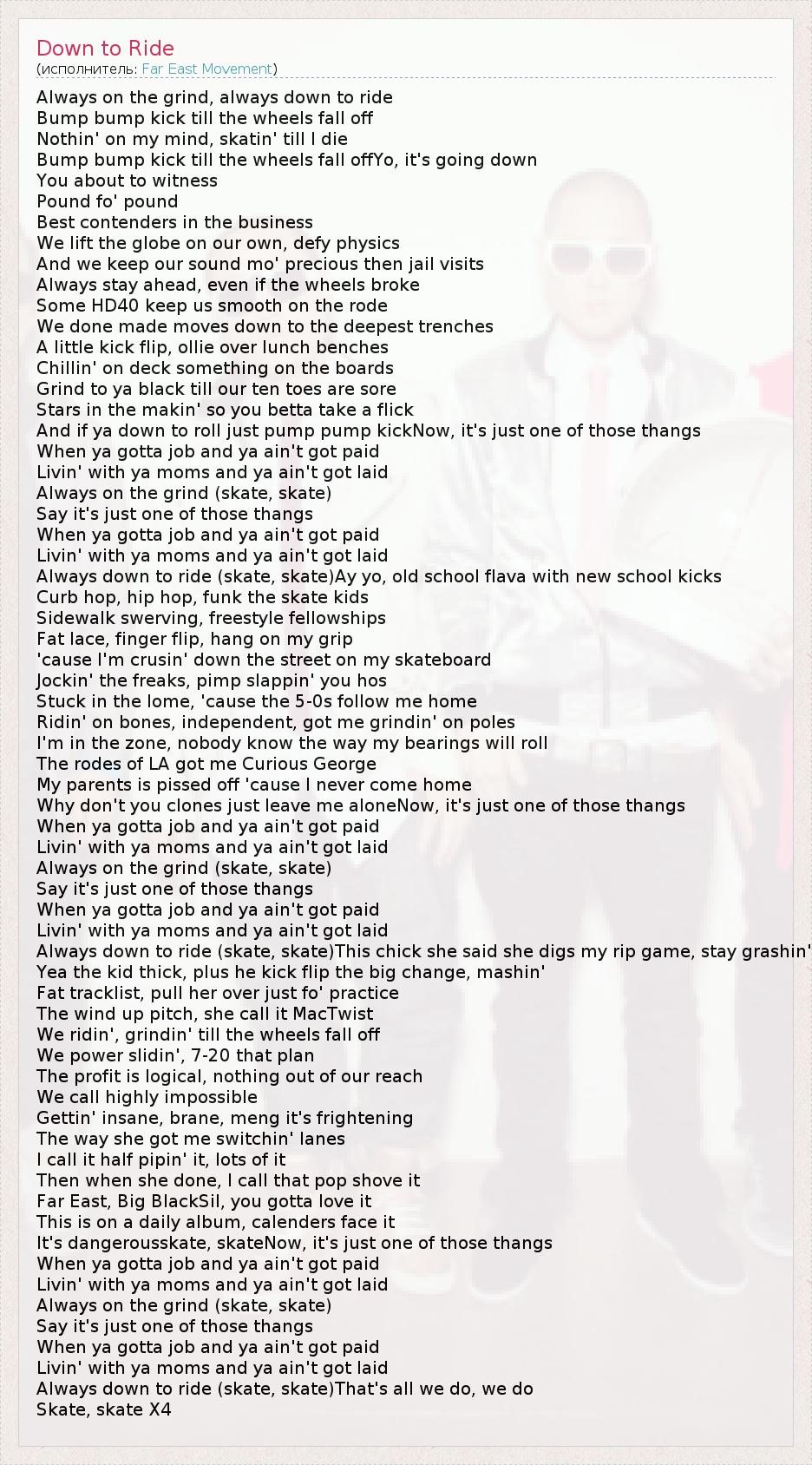 Always down to ride (skate, skate)This chick she said she digs my rip game, stay grashin'