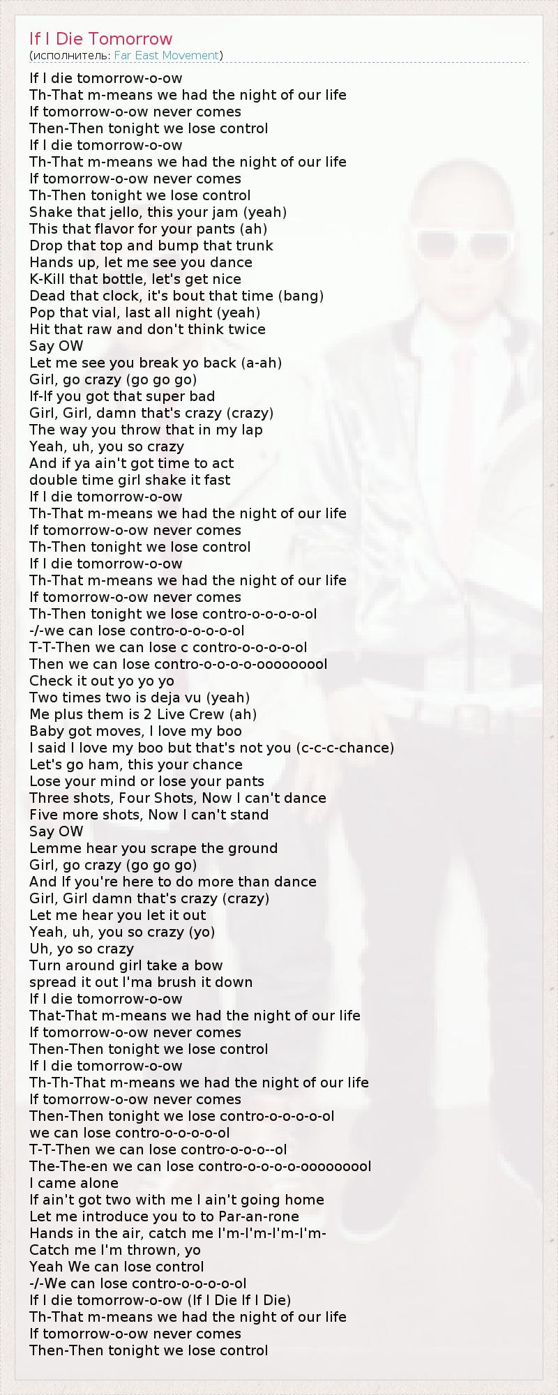 If I die tomorrow-o-ow Th-That m-means we had the night of our life If tomorrow-o-ow never comes Then-Then tonight we lose control If I die tomorrow-o-ow Th-That m-means we had the night of our life If tomorrow-o-ow never comes Th-Then tonight we lose control Shake that jello, this your jam (yeah) This that flavor for your pants (ah) Drop that top and bump that trunk Hands up, let me see you dance K-Kill that bottle, let's get nice Dead that clock, it's bout that time (bang) Pop that vial, last all night (yeah) Hit that raw and don't think twice Say OW Let me see you break yo back (a-ah) Girl, go crazy (go go go) If-If you got that super bad Girl, Girl, damn that's crazy (crazy) The way you throw that in my lap Yeah, uh, you so crazy And if ya ain't got time to act double time girl shake it fast If I die tomorrow-o-ow Th-That m-means we had the night of our life If tomorrow-o-ow never comes Th-Then tonight we lose control If I die tomorrow-o-ow Th-That m-means we had the night of our life If tomorrow-o-ow never comes Th-Then tonight we lose contro-o-o-o-o-ol -/-we can lose contro-o-o-o-o-ol T-T-Then we can lose c contro-o-o-o-o-ol Then we can lose contro-o-o-o-o-ooooooool Check it out yo yo yo Two times two is deja vu (yeah) Me plus them is 2 Live Crew (ah) Baby got moves, I love my boo I said I love my boo but that's not you (c-c-c-chance) Let's go ham, this your chance Lose your mind or lose your pants Three shots, Four Shots, Now I can't dance Five more shots, Now I can't stand Say OW Lemme hear you scrape the ground Girl, go crazy (go go go) And If you're here to do more than dance Girl, Girl damn that's crazy (crazy) Let me hear you let it out Yeah, uh, you so crazy (yo) Uh, yo so crazy Turn around girl take a bow spread it out I'ma brush it down If I die tomorrow-o-ow That-That m-means we had the night of our life If tomorrow-o-ow never comes Then-Then tonight we lose control If I die tomorrow-o-ow Th-Th-That m-means we had the night of our life If tomorrow-o-ow never comes Then-Then tonight we lose contro-o-o-o-o-ol we can lose contro-o-o-o-o-ol T-T-Then we can lose contro-o-o-o--ol The-The-en we can lose contro-o-o-o-o-ooooooool I came alone If ain't got two with me I ain't going home Let me introduce you to to Par-an-rone Hands in the air, catch me I'm-I'm-I'm-I'm- Catch me I'm thrown, yo Yeah We can lose control -/-We can lose contro-o-o-o-o-ol If I die tomorrow-o-ow (If I Die If I Die) Th-That m-means we had the night of our life If tomorrow-o-ow never comes Then-Then tonight we lose control