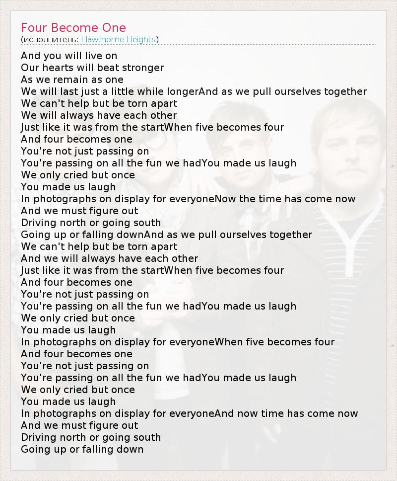 And you will live on Our hearts will beat stronger As we remain as one We will last just a little while longerAnd as we pull ourselves together We can't help but be torn apart We will always have each other Just like it was from the startWhen five becomes four And four becomes one You're not just passing on You're passing on all the fun we hadYou made us laugh We only cried but once You made us laugh In photographs on display for everyoneNow the time has come now And we must figure out Driving north or going south Going up or falling downAnd as we pull ourselves together We can't help but be torn apart And we will always have each other Just like it was from the startWhen five becomes four And four becomes one You're not just passing on You're passing on all the fun we hadYou made us laugh We only cried but once You made us laugh In photographs on display for everyoneWhen five becomes four And four becomes one You're not just passing on You're passing on all the fun we hadYou made us laugh We only cried but once You made us laugh In photographs on display for everyoneAnd now time has come now And we must figure out Driving north or going south Going up or falling down