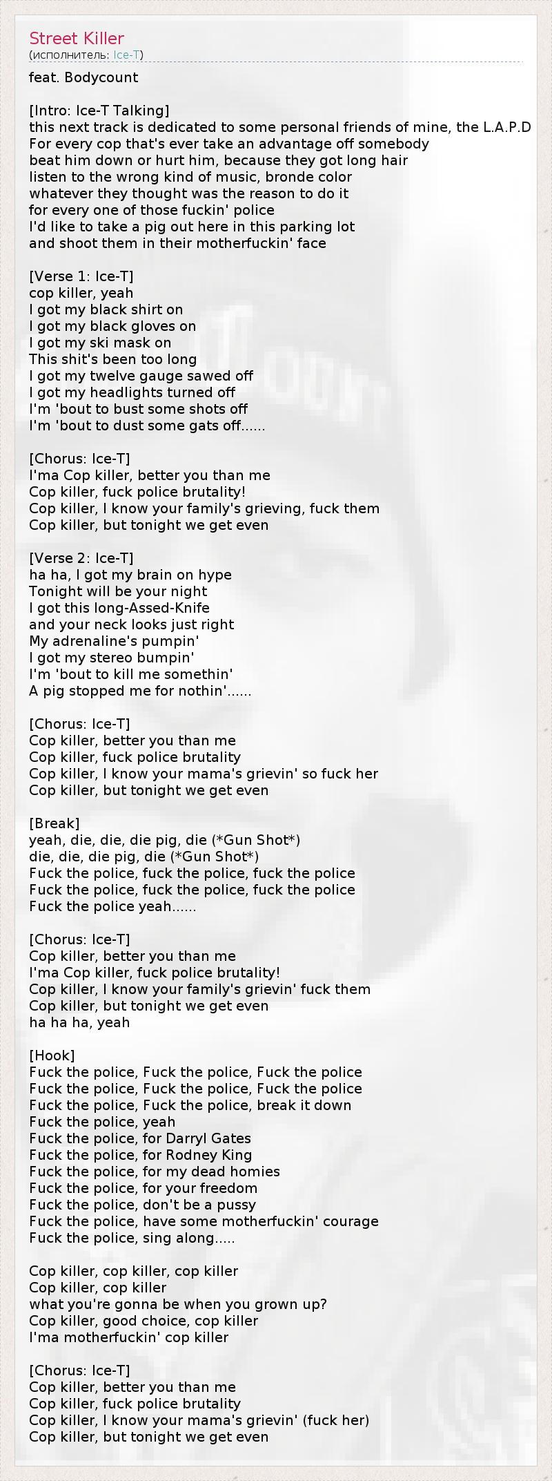 feat. Bodycount [Intro: Ice-T Talking] this next track is dedicated to some personal friends of mine, the L.A.P.D For every cop that's ever take an advantage off somebody beat him down or hurt him, because they got long hair listen to the wrong kind of music, bronde color whatever they thought was the reason to do it for every one of those fuckin' police I'd like to take a pig out here in this parking lot and shoot them in their motherfuckin' face [Verse 1: Ice-T] cop killer, yeah I got my black shirt on I got my black gloves on I got my ski mask on This shit's been too long I got my twelve gauge sawed off I got my headlights turned off I'm 'bout to bust some shots off I'm 'bout to dust some gats off...... [Chorus: Ice-T] I'ma Cop killer, better you than me Cop killer, fuck police brutality! Cop killer, I know your family's grieving, fuck them Cop killer, but tonight we get even [Verse 2: Ice-T] ha ha, I got my brain on hype Tonight will be your night I got this long-Assed-Knife and your neck looks just right My adrenaline's pumpin' I got my stereo bumpin' I'm 'bout to kill me somethin' A pig stopped me for nothin'...... [Chorus: Ice-T] Cop killer, better you than me Cop killer, fuck police brutality Cop killer, I know your mama's grievin' so fuck her Cop killer, but tonight we get even [Break] yeah, die, die, die pig, die (*Gun Shot*) die, die, die pig, die (*Gun Shot*) Fuck the police, fuck the police, fuck the police Fuck the police, fuck the police, fuck the police Fuck the police yeah...... [Chorus: Ice-T] Cop killer, better you than me I'ma Cop killer, fuck police brutality! Cop killer, I know your family's grievin' fuck them Cop killer, but tonight we get even ha ha ha, yeah [Hook] Fuck the police, Fuck the police, Fuck the police Fuck the police, Fuck the police, Fuck the police Fuck the police, Fuck the police, break it down Fuck the police, yeah Fuck the police, for Darryl Gates Fuck the police, for Rodney King Fuck the police, for my dead homies Fuck the police, for your freedom Fuck the police, don't be a pussy Fuck the police, have some motherfuckin' courage Fuck the police, sing along..... Cop killer, cop killer, cop killer Cop killer, cop killer what you're gonna be when you grown up? Cop killer, good choice, cop killer I'ma motherfuckin' cop killer [Chorus: Ice-T] Cop killer, better you than me Cop killer, fuck police brutality Cop killer, I know your mama's grievin' (fuck her) Cop killer, but tonight we get even