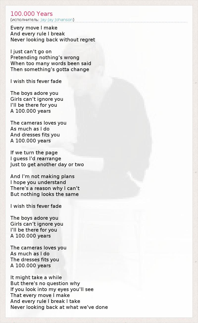 Every move I make And every rule I break Never looking back without regret I just can't go on Pretending nothing's wrong When too many words been said Then something's gotta change I wish this fever fade The boys adore you Girls can't ignore you I'll be there for you A 100.000 years The cameras loves you As much as I do And dresses fits you A 100.000 years If we turn the page I guess I'd rearrange Just to get another day or two And I'm not making plans I hope you understand There's a reason why I can't But nothing looks the same I wish this fever fade The boys adore you Girls can't ignore you I'll be there for you A 100.000 years The cameras loves you As much as I do The dresses fits you A 100.000 years It might take a while But there's no question why If you look into my eyes you'll see That every move I make And every rule I break I take Never looking back at what we've done