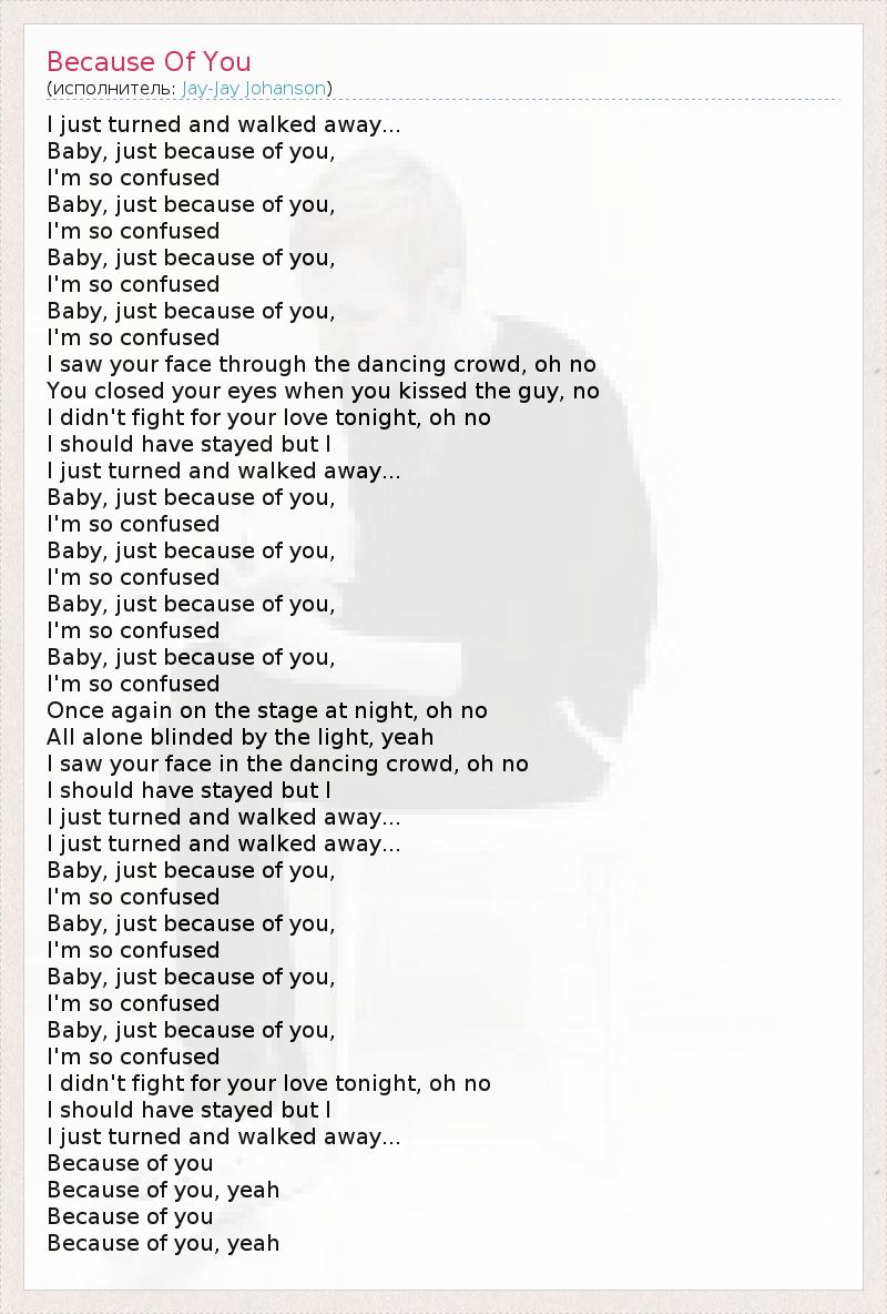 I just turned and walked away... Baby, just because of you, I'm so confused Baby, just because of you, I'm so confused Baby, just because of you, I'm so confused Baby, just because of you, I'm so confused I saw your face through the dancing crowd, oh no You closed your eyes when you kissed the guy, no I didn't fight for your love tonight, oh no I should have stayed but I I just turned and walked away... Baby, just because of you, I'm so confused Baby, just because of you, I'm so confused Baby, just because of you, I'm so confused Baby, just because of you, I'm so confused Once again on the stage at night, oh no All alone blinded by the light, yeah I saw your face in the dancing crowd, oh no I should have stayed but I I just turned and walked away... I just turned and walked away... Baby, just because of you, I'm so confused Baby, just because of you, I'm so confused Baby, just because of you, I'm so confused Baby, just because of you, I'm so confused I didn't fight for your love tonight, oh no I should have stayed but I I just turned and walked away... Because of you Because of you, yeah Because of you Because of you, yeah