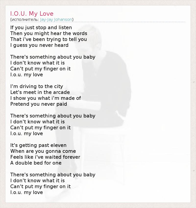 If you just stop and listen Then you might hear the words That i've been trying to tell you I guess you never heard There's something about you baby I don't know what it is Can't put my finger on it I.o.u. my love I'm driving to the city Let's meet in the arcade I show you what i'm made of Pretend you never paid There's something about you baby I don't know what it is Can't put my finger on it I.o.u. my love It's getting past eleven When are you gonna come Feels like i've waited forever A double bed for one There's something about you baby I don't know what it is Can't put my finger on it I.o.u. my love