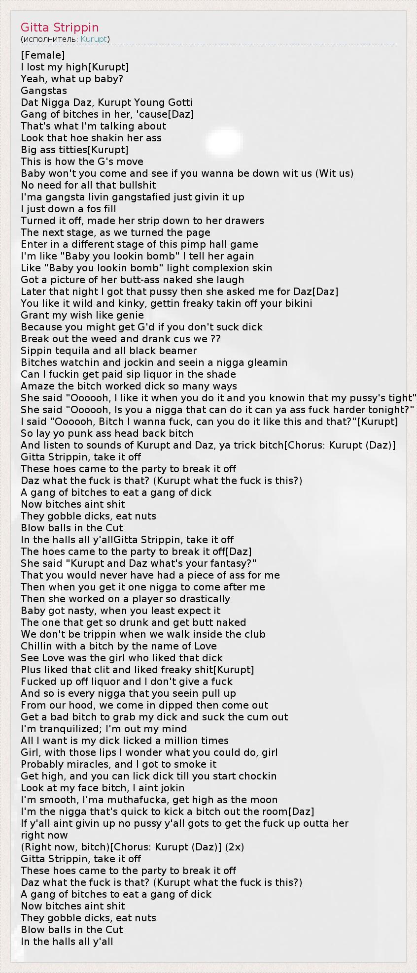 [Female] I lost my high[Kurupt] Yeah, what up baby? Gangstas Dat Nigga Daz, Kurupt Young Gotti Gang of bitches in her, 'cause[Daz] That's what I'm talking about Look that hoe shakin her ass Big ass titties[Kurupt] This is how the G's move Baby won't you come and see if you wanna be down wit us (Wit us) No need for all that bullshit I'ma gangsta livin gangstafied just givin it up I just down a fos fill Turned it off, made her strip down to her drawers The next stage, as we turned the page Enter in a different stage of this pimp hall game I'm like "Baby you lookin bomb" I tell her again Like "Baby you lookin bomb" light complexion skin Got a picture of her butt-ass naked she laugh Later that night I got that pussy then she asked me for Daz[Daz] You like it wild and kinky, gettin freaky takin off your bikini Grant my wish like genie Because you might get G'd if you don't suck dick Break out the weed and drank cus we ?? Sippin tequila and all black beamer Bitches watchin and jockin and seein a nigga gleamin Can I fuckin get paid sip liquor in the shade Amaze the bitch worked dick so many ways She said "Oooooh, I like it when you do it and you knowin that my pussy's tight" She said "Oooooh, Is you a nigga that can do it can ya ass fuck harder tonight?" I said "Oooooh, Bitch I wanna fuck, can you do it like this and that?"[Kurupt] So lay yo punk ass head back bitch And listen to sounds of Kurupt and Daz, ya trick bitch[Chorus: Kurupt (Daz)] Gitta Strippin, take it off These hoes came to the party to break it off Daz what the fuck is that? (Kurupt what the fuck is this?) A gang of bitches to eat a gang of dick Now bitches aint shit They gobble dicks, eat nuts Blow balls in the Cut In the halls all y'allGitta Strippin, take it off The hoes came to the party to break it off[Daz] She said "Kurupt and Daz what's your fantasy?" That you would never have had a piece of ass for me Then when you get it one nigga to come after me Then she worked on a player so drastically Baby got nasty, when you least expect it The one that get so drunk and get butt naked We don't be trippin when we walk inside the club Chillin with a bitch by the name of Love See Love was the girl who liked that dick Plus liked that clit and liked freaky shit[Kurupt] Fucked up off liquor and I don't give a fuck And so is every nigga that you seein pull up From our hood, we come in dipped then come out Get a bad bitch to grab my dick and suck the cum out I'm tranquilized; I'm out my mind All I want is my dick licked a million times Girl, with those lips I wonder what you could do, girl Probably miracles, and I got to smoke it Get high, and you can lick dick till you start chockin Look at my face bitch, I aint jokin I'm smooth, I'ma muthafucka, get high as the moon I'm the nigga that's quick to kick a bitch out the room[Daz] If y'all aint givin up no pussy y'all gots to get the fuck up outta her right now (Right now, bitch)[Chorus: Kurupt (Daz)] (2x) Gitta Strippin, take it off These hoes came to the party to break it off Daz what the fuck is that? (Kurupt what the fuck is this?) A gang of bitches to eat a gang of dick Now bitches aint shit They gobble dicks, eat nuts Blow balls in the Cut In the halls all y'all