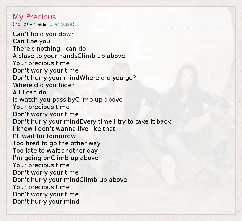 Can't hold you down Can I be you There's nothing I can do A slave to your handsClimb up above Your precious time Don't worry your time Don't hurry your mindWhere did you go? Where did you hide? All I can do Is watch you pass byClimb up above Your precious time Don't worry your time Don't hurry your mindEvery time I try to take it back I know I don't wanna live like that I'll wait for tomorrow Too tired to go the other way Too late to wait another day I'm going onClimb up above Your precious time Don't worry your time Don't hurry your mindClimb up above Your precious time Don't worry your time Don't hurry your mind