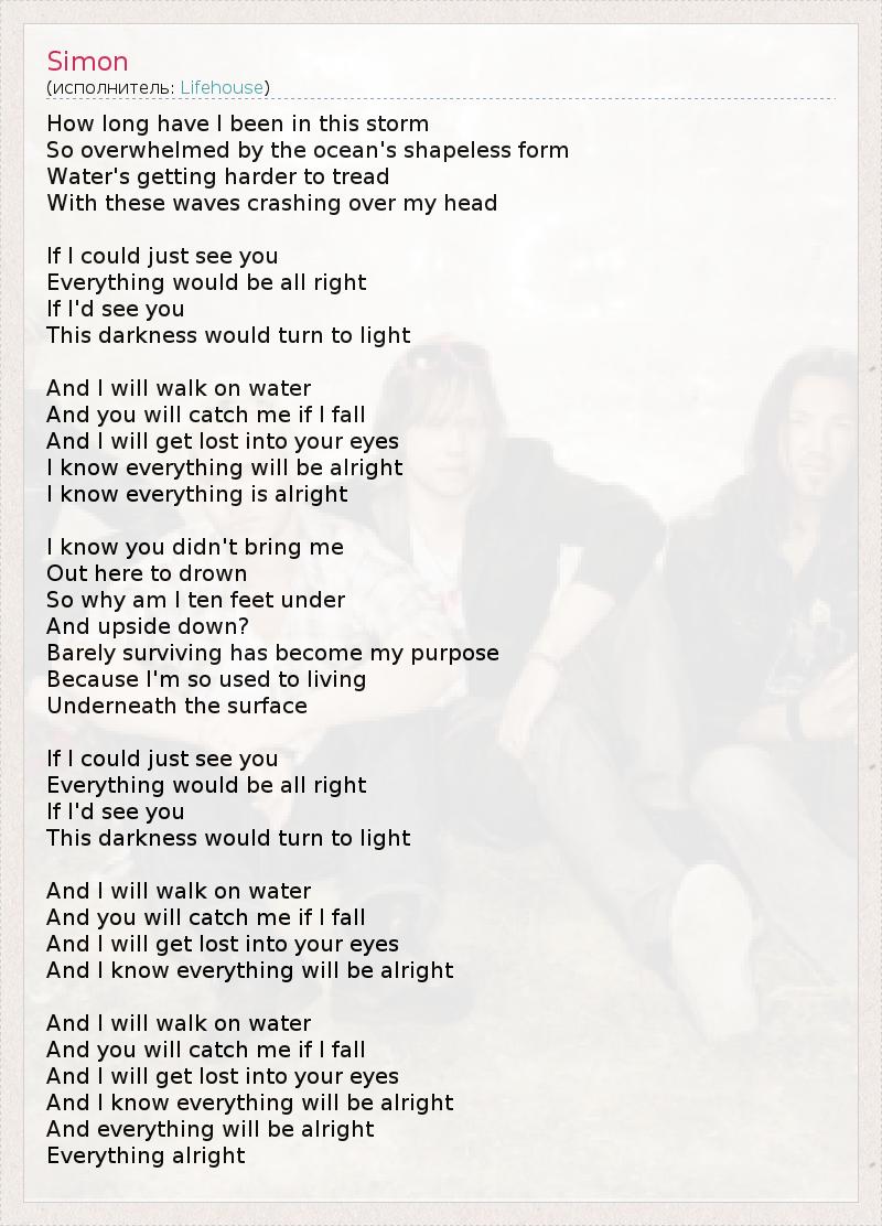 Как долго уже я посреди этого шторма, Ошеломленный бесформенностью океана? Вода отвердевает, и я иду по ней, А волны разбиваются над моей головой Если б я только мог тебя увидеть, Все стало бы хорошо, Если б я тебя увидел, Эта тьма превратилась бы в свет Я буду идти по воде, А ты поймаешь меня, если упаду. Я потеряюсь в твоих глазах, Знаю, всё будет хорошо, Я знаю, всё хорошо Знаю, ты привела меня сюда Не для того, чтоб я утонул, Так отчего же я под водой на глубине Десяти футов, вверх тормашками? Моей целью стало просто выжить, Ведь мне так привычно Жить под гладью воды 1 Если б я только мог тебя увидеть, Все стало бы хорошо, Если б я тебя увидел, Эта тьма превратилась бы в свет Я буду идти по воде, А ты поймаешь меня, если упаду. Я потеряюсь в твоих глазах, Знаю, всё будет хорошо Я буду идти по воде, А ты поймаешь меня, если упаду. Я потеряюсь в твоих глазах, Знаю, всё будет хорошо, Всё будет хорошо, Всё хорошо 1 - дословно – под поверхностью