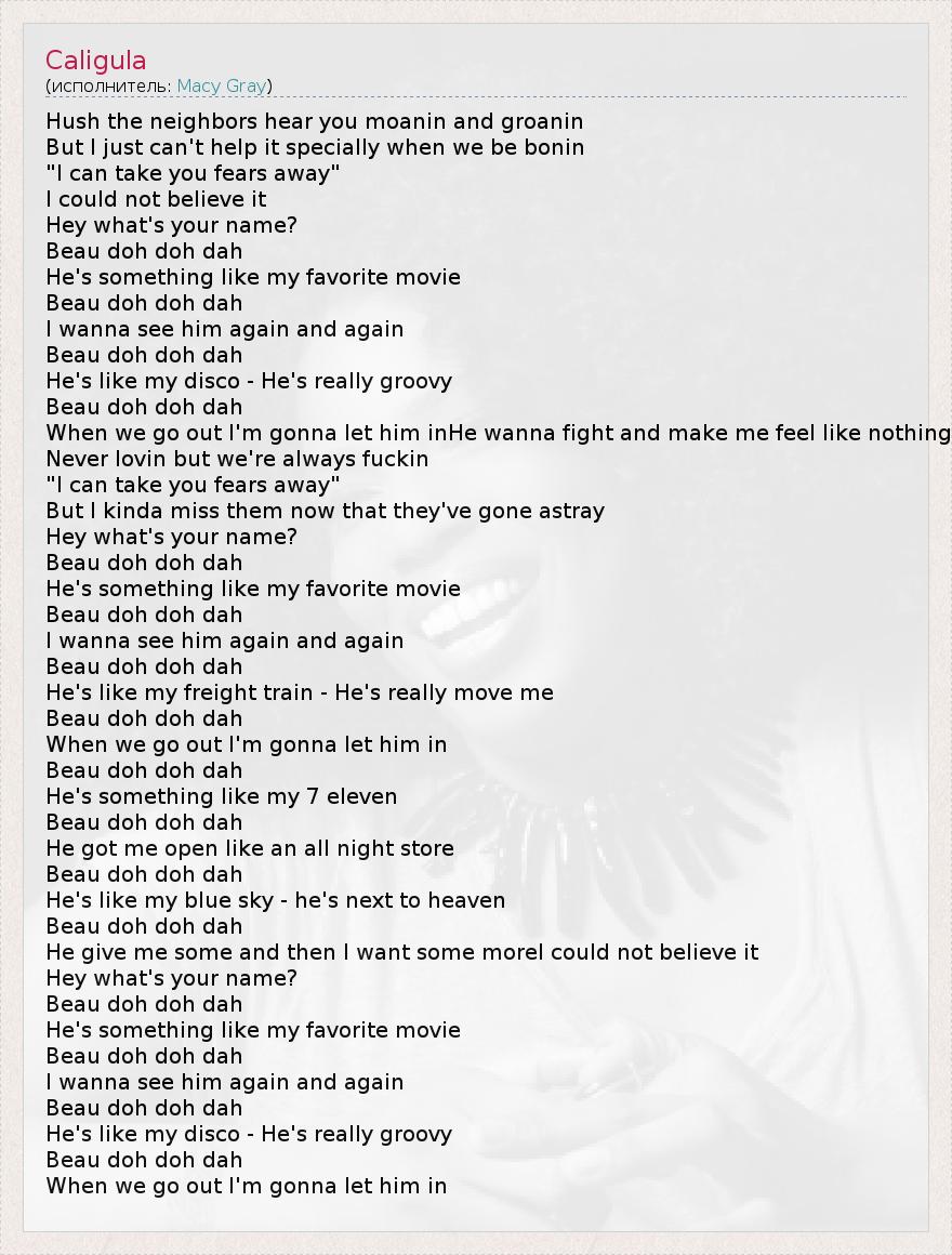 Hush the neighbors hear you moanin and groanin But I just can't help it specially when we be bonin "I can take you fears away" I could not believe it Hey what's your name? Beau doh doh dah He's something like my favorite movie Beau doh doh dah I wanna see him again and again Beau doh doh dah He's like my disco - He's really groovy Beau doh doh dah When we go out I'm gonna let him inHe wanna fight and make me feel like nothing Never lovin but we're always fuckin "I can take you fears away" But I kinda miss them now that they've gone astray Hey what's your name? Beau doh doh dah He's something like my favorite movie Beau doh doh dah I wanna see him again and again Beau doh doh dah He's like my freight train - He's really move me Beau doh doh dah When we go out I'm gonna let him in Beau doh doh dah He's something like my 7 eleven Beau doh doh dah He got me open like an all night store Beau doh doh dah He's like my blue sky - he's next to heaven Beau doh doh dah He give me some and then I want some moreI could not believe it Hey what's your name? Beau doh doh dah He's something like my favorite movie Beau doh doh dah I wanna see him again and again Beau doh doh dah He's like my disco - He's really groovy Beau doh doh dah When we go out I'm gonna let him in