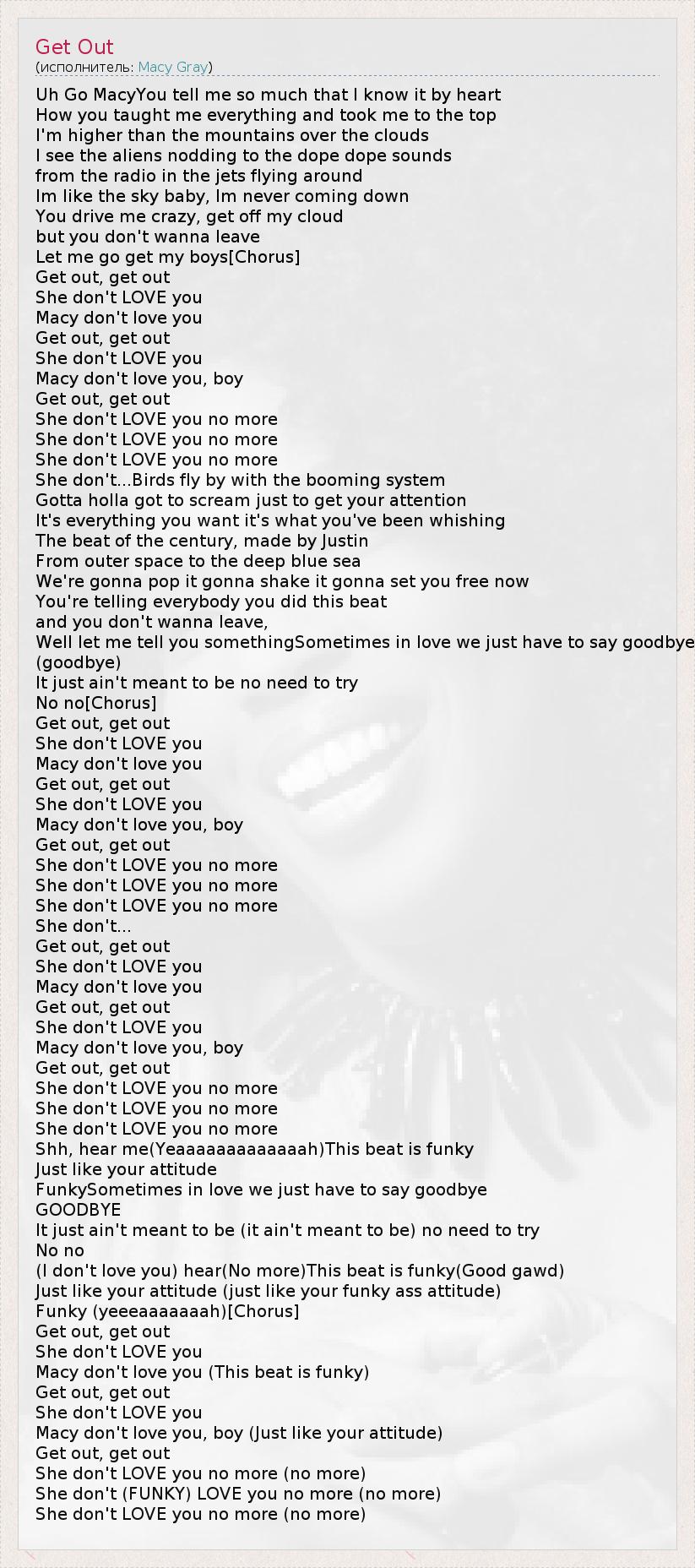 Uh Go MacyYou tell me so much that I know it by heart How you taught me everything and took me to the top I'm higher than the mountains over the clouds I see the aliens nodding to the dope dope sounds from the radio in the jets flying around Im like the sky baby, Im never coming down You drive me crazy, get off my cloud but you don't wanna leave Let me go get my boys[Chorus] Get out, get out She don't LOVE you Macy don't love you Get out, get out She don't LOVE you Macy don't love you, boy Get out, get out She don't LOVE you no more She don't LOVE you no more She don't LOVE you no more She don't...Birds fly by with the booming system Gotta holla got to scream just to get your attention It's everything you want it's what you've been whishing The beat of the century, made by Justin From outer space to the deep blue sea We're gonna pop it gonna shake it gonna set you free now You're telling everybody you did this beat and you don't wanna leave, Well let me tell you somethingSometimes in love we just have to say goodbye (goodbye) It just ain't meant to be no need to try No no[Chorus] Get out, get out She don't LOVE you Macy don't love you Get out, get out She don't LOVE you Macy don't love you, boy Get out, get out She don't LOVE you no more She don't LOVE you no more She don't LOVE you no more She don't... Get out, get out She don't LOVE you Macy don't love you Get out, get out She don't LOVE you Macy don't love you, boy Get out, get out She don't LOVE you no more She don't LOVE you no more She don't LOVE you no more Shh, hear me(Yeaaaaaaaaaaaaah)This beat is funky Just like your attitude FunkySometimes in love we just have to say goodbye GOODBYE It just ain't meant to be (it ain't meant to be) no need to try No no (I don't love you) hear(No more)This beat is funky(Good gawd) Just like your attitude (just like your funky ass attitude) Funky (yeeeaaaaaaah)[Chorus] Get out, get out She don't LOVE you Macy don't love you (This beat is funky) Get out, get out She don't LOVE you Macy don't love you, boy (Just like your attitude) Get out, get out She don't LOVE you no more (no more) She don't (FUNKY) LOVE you no more (no more) She don't LOVE you no more (no more)