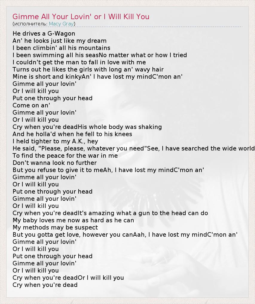 ГлавнаяИсполнителиMacy GrayGimme All Your Lovin' or I Will Kill You