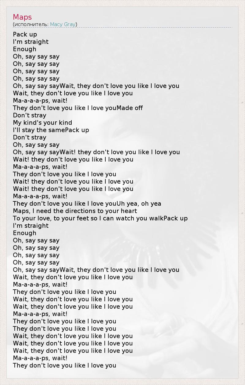 Pack up I'm straight Enough Oh, say say say Oh, say say say Oh, say say say Oh, say say say Oh, say say sayWait, they don't love you like I love you Wait, they don't love you like I love you Ma-a-a-a-ps, wait! They don't love you like I love youMade off Don't stray My kind's your kind I'll stay the samePack up Don't stray Oh, say say say Oh, say say sayWait! they don't love you like I love you Wait! they don't love you like I love you Ma-a-a-a-ps, wait! They don't love you like I love you Wait! they don't love you like I love you Wait! they don't love you like I love you Ma-a-a-a-ps, wait! They don't love you like I love youUh yea, oh yea Maps, I need the directions to your heart To your love, to your feet so I can watch you walkPack up I'm straight Enough Oh, say say say Oh, say say say Oh, say say say Oh, say say say Oh, say say sayWait, they don't love you like I love you Wait, they don't love you like I love you Ma-a-a-a-ps, wait! They don't love you like I love you Wait, they don't love you like I love you Wait, they don't love you like I love you Ma-a-a-a-ps, wait! They don't love you like I love you They don't love you like I love you Wait, they don't love you like I love you Wait, they don't love you like I love you Wait, they don't love you like I love you Ma-a-a-a-ps, wait! They don't love you like I love you
