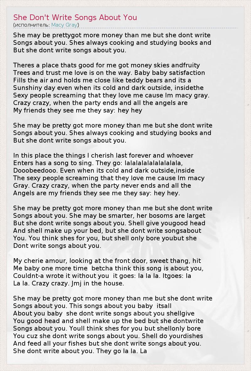 А как ты думаешь, о чем песня "She Don't Write Songs About You" ?