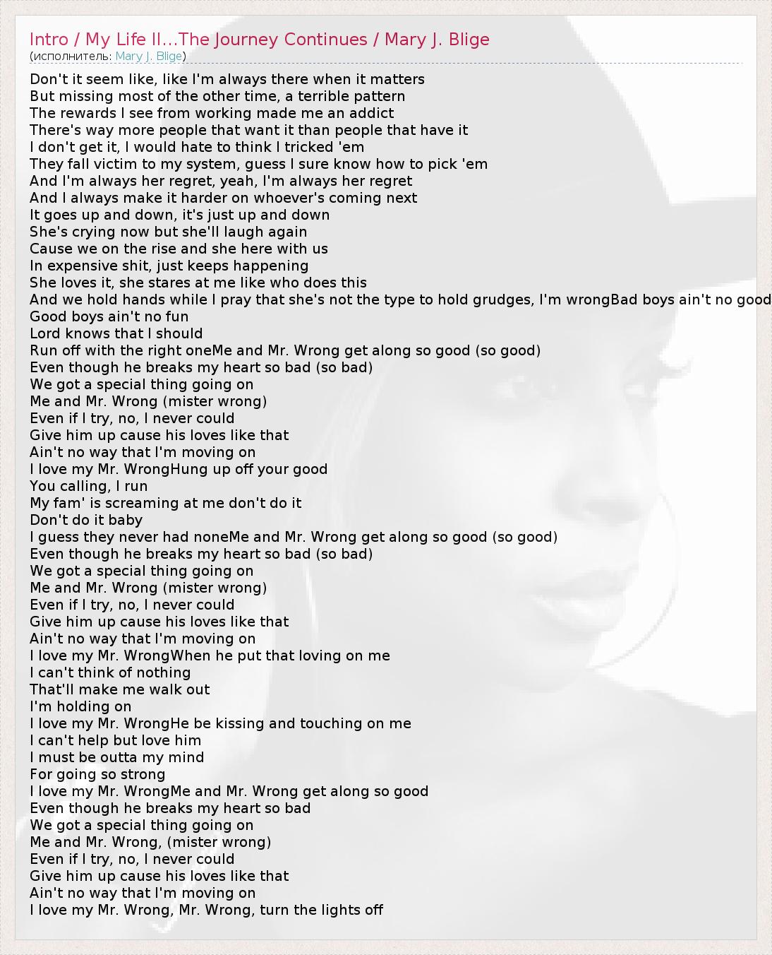 А как ты думаешь, о чем песня "Intro / My Life II...The Journey Continues / Mary J. Blige" ?