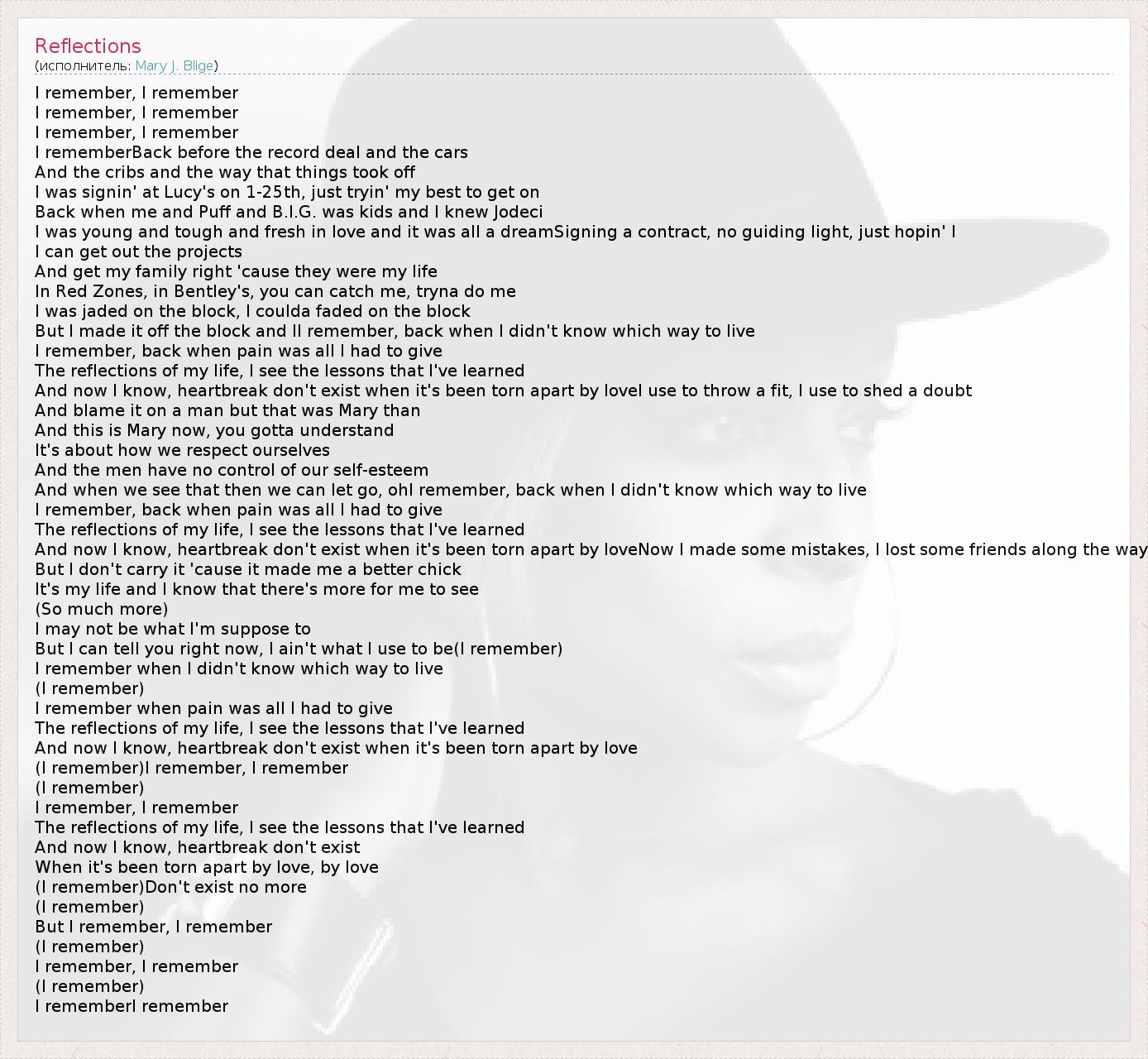 I remember, I remember I remember, I remember I remember, I remember I rememberBack before the record deal and the cars And the cribs and the way that things took off I was signin' at Lucy's on 1-25th, just tryin' my best to get on Back when me and Puff and B.I.G. was kids and I knew Jodeci I was young and tough and fresh in love and it was all a dreamSigning a contract, no guiding light, just hopin' I I can get out the projects And get my family right 'cause they were my life In Red Zones, in Bentley's, you can catch me, tryna do me I was jaded on the block, I coulda faded on the block But I made it off the block and II remember, back when I didn't know which way to live I remember, back when pain was all I had to give The reflections of my life, I see the lessons that I've learned And now I know, heartbreak don't exist when it's been torn apart by loveI use to throw a fit, I use to shed a doubt And blame it on a man but that was Mary than And this is Mary now, you gotta understand It's about how we respect ourselves And the men have no control of our self-esteem And when we see that then we can let go, ohI remember, back when I didn't know which way to live I remember, back when pain was all I had to give The reflections of my life, I see the lessons that I've learned And now I know, heartbreak don't exist when it's been torn apart by loveNow I made some mistakes, I lost some friends along the way But I don't carry it 'cause it made me a better chick It's my life and I know that there's more for me to see (So much more) I may not be what I'm suppose to But I can tell you right now, I ain't what I use to be(I remember) I remember when I didn't know which way to live (I remember) I remember when pain was all I had to give The reflections of my life, I see the lessons that I've learned And now I know, heartbreak don't exist when it's been torn apart by love (I remember)I remember, I remember (I remember) I remember, I remember The reflections of my life, I see the lessons that I've learned And now I know, heartbreak don't exist When it's been torn apart by love, by love (I remember)Don't exist no more (I remember) But I remember, I remember (I remember) I remember, I remember (I remember) I rememberI remember