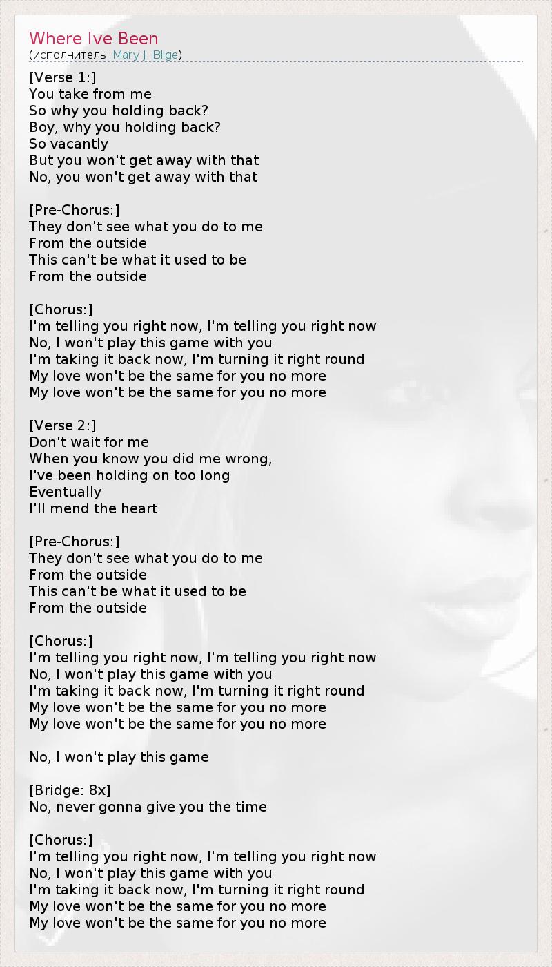 [Verse 1:] You take from me So why you holding back? Boy, why you holding back? So vacantly But you won't get away with that No, you won't get away with that [Pre-Chorus:] They don't see what you do to me From the outside This can't be what it used to be From the outside [Chorus:] I'm telling you right now, I'm telling you right now No, I won't play this game with you I'm taking it back now, I'm turning it right round My love won't be the same for you no more My love won't be the same for you no more [Verse 2:] Don't wait for me When you know you did me wrong, I've been holding on too long Eventually I'll mend the heart [Pre-Chorus:] They don't see what you do to me From the outside This can't be what it used to be From the outside [Chorus:] I'm telling you right now, I'm telling you right now No, I won't play this game with you I'm taking it back now, I'm turning it right round My love won't be the same for you no more My love won't be the same for you no more No, I won't play this game [Bridge: 8x] No, never gonna give you the time [Chorus:] I'm telling you right now, I'm telling you right now No, I won't play this game with you I'm taking it back now, I'm turning it right round My love won't be the same for you no more My love won't be the same for you no more