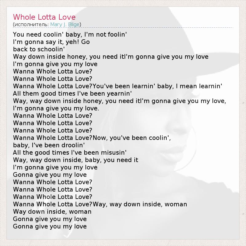 You need coolin' baby, I'm not foolin' I'm gonna say it, yeh! Go back to schoolin' Way down inside honey, you need itI'm gonna give you my love I'm gonna give you my love Wanna Whole Lotta Love? Wanna Whole Lotta Love? Wanna Whole Lotta Love?You've been learnin' baby, I mean learnin' All them good times I've been yearnin' Way, way down inside honey, you need itI'm gonna give you my love, I'm gonna give you my love. Wanna Whole Lotta Love? Wanna Whole Lotta Love? Wanna Whole Lotta Love? Wanna Whole Lotta Love?Now, you've been coolin', baby, I've been droolin' All the good times I've been misusin' Way, way down inside, baby, you need it I'm gonna give you my love Gonna give you my love Wanna Whole Lotta Love? Wanna Whole Lotta Love? Wanna Whole Lotta Love? Wanna Whole Lotta Love?Way, way down inside, woman Way down inside, woman Gonna give you my love Gonna give you my love