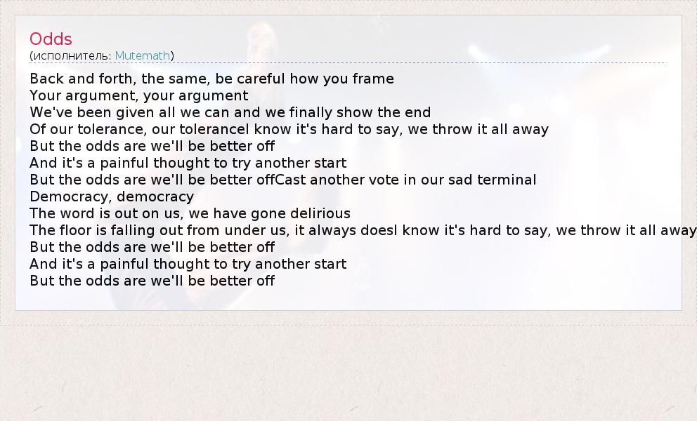 Это интересно:Группа MuteMath стартовала в 2002-м году в Новом Орлеане, как сторонний проект двух человек - Дарена Кинга и Пола Мэни. Изначально группа называлась The Digitals, потом парни переименовались в Math, но из-за того, что группа с таким же именем уже существовала, название было расширено до MuteMath.До создания собственного проекта Пол был известен, как клавишник и вокалист группы Earthsuit, которая начала свое... продолжение