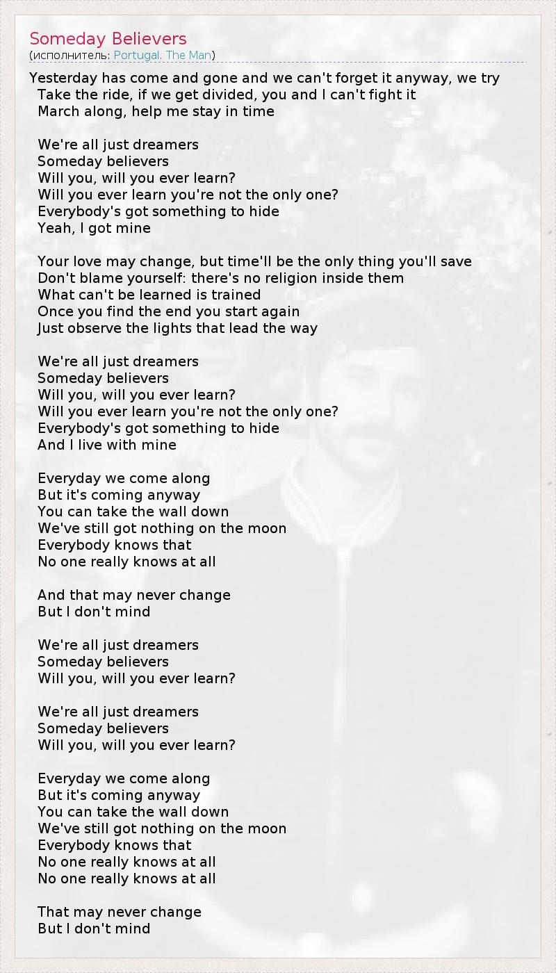 Yesterday has come and gone and we can't forget it anyway, we try Take the ride, if we get divided, you and I can't fight it March along, help me stay in time We're all just dreamers Someday believers Will you, will you ever learn? Will you ever learn you're not the only one? Everybody's got something to hide Yeah, I got mine Your love may change, but time'll be the only thing you'll save Don't blame yourself: there's no religion inside them What can't be learned is trained Once you find the end you start again Just observe the lights that lead the way We're all just dreamers Someday believers Will you, will you ever learn? Will you ever learn you're not the only one? Everybody's got something to hide And I live with mine Everyday we come along But it's coming anyway You can take the wall down We've still got nothing on the moon Everybody knows that No one really knows at all And that may never change But I don't mind We're all just dreamers Someday believers Will you, will you ever learn? We're all just dreamers Someday believers Will you, will you ever learn? Everyday we come along But it's coming anyway You can take the wall down We've still got nothing on the moon Everybody knows that No one really knows at all No one really knows at all That may never change But I don't mind