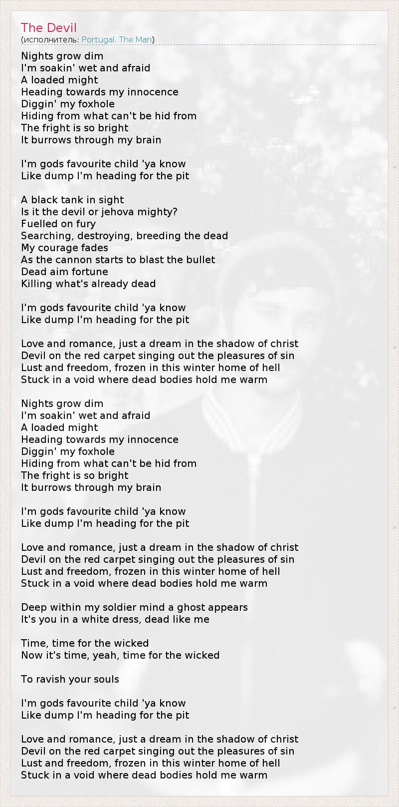 Nights grow dim I'm soakin' wet and afraid A loaded might Heading towards my innocence Diggin' my foxhole Hiding from what can't be hid from The fright is so bright It burrows through my brain I'm gods favourite child 'ya know Like dump I'm heading for the pit A black tank in sight Is it the devil or jehova mighty? Fuelled on fury Searching, destroying, breeding the dead My courage fades As the cannon starts to blast the bullet Dead aim fortune Killing what's already dead I'm gods favourite child 'ya know Like dump I'm heading for the pit Love and romance, just a dream in the shadow of christ Devil on the red carpet singing out the pleasures of sin Lust and freedom, frozen in this winter home of hell Stuck in a void where dead bodies hold me warm Nights grow dim I'm soakin' wet and afraid A loaded might Heading towards my innocence Diggin' my foxhole Hiding from what can't be hid from The fright is so bright It burrows through my brain I'm gods favourite child 'ya know Like dump I'm heading for the pit Love and romance, just a dream in the shadow of christ Devil on the red carpet singing out the pleasures of sin Lust and freedom, frozen in this winter home of hell Stuck in a void where dead bodies hold me warm Deep within my soldier mind a ghost appears It's you in a white dress, dead like me Time, time for the wicked Now it's time, yeah, time for the wicked To ravish your souls I'm gods favourite child 'ya know Like dump I'm heading for the pit Love and romance, just a dream in the shadow of christ Devil on the red carpet singing out the pleasures of sin Lust and freedom, frozen in this winter home of hell Stuck in a void where dead bodies hold me warm