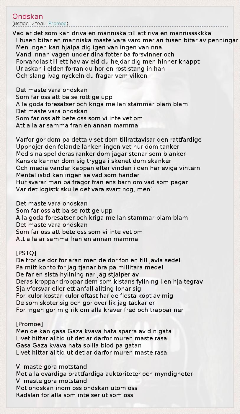 Vad ar det som kan driva en manniska till att riva en mannissskkka I tusen bitar en manniska maste vara vard mer an tusen bitar av penningar Men ingen kan hjalpa dig igen van ingen vaninna Vand innan vagen under dina fotter ba forsvinner och Forvandlas till ett hav av eld du hejdar dig men hinner knappt Ur askan i elden forran du hor en rost stang in han Och slang ivag nyckeln du fragar vem vilken Det maste vara ondskan Som far oss att ba se rott ge upp Alla goda foresatser och kriga mellan stammar blam blam Det maste vara ondskan Som far oss att bete oss som vi inte vet om Att alla ar samma fran en annan mamma Varfor gor dom pa detta viset dom tillrattavisar den rattfardige Upphojer den felande lanken ingen vet hur dom tanker Med sina spel deras ranker dom jagar stenar som blanker Kanske kanner dom sig trygga i skenet dom skanker Och media vander kappan efter vinden i den har eviga vintern Mental istid kan ingen se vad som hander Hur svarar man pa fragor fran ens barn om vad som pagar Var det logistk skulle det vara svart nog, men' Det maste vara ondskan Som far oss att ba se rott ge upp Alla goda foresatser och kriga mellan stammar blam blam Det maste vara ondskan Som far oss att bete oss som vi inte vet om Att alla ar samma fran en annan mamma [PSTQ] De tror de dor for aran men de dor fon en till javla sedel Pa mitt konto for jag tjanar bra pa millitara medel De far en sista hyllning nar jag stjalper av Deras kroppar droppar dem som kistans fyllning i en hjaltegrav Sjalvforsvar eller ett anfall allting lonar sig For kulor kostar kulor oftast har de flesta kopt av mig De som skoter sig och gor over lik jag tackar er For ingen gor mig rik om alla kraver fred och trappar ner [Promoe] Men de kan gasa Gaza kvava hata sparra av din gata Livet hittar alltid ut det ar darfor muren maste rasa Gasa Gaza kvava hata spilla blod pa gatan Livet hittar alltid ut det ar darfor muren maste rasa Vi maste gora motstand Mot alla ovardiga orattfardiga auktoriteter och myndigheter Vi maste gora motstand Mot ondskan inom oss ondskan utom oss Radslan for alla som inte ser ut som oss