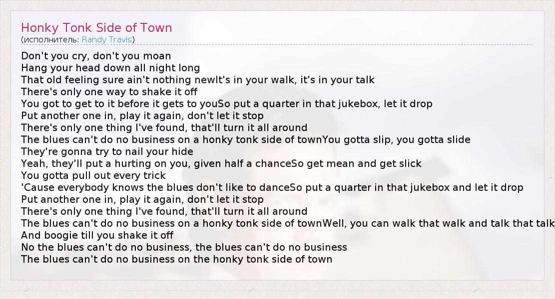 А как ты думаешь, о чем песня "Honky Tonk Side of Town" ?