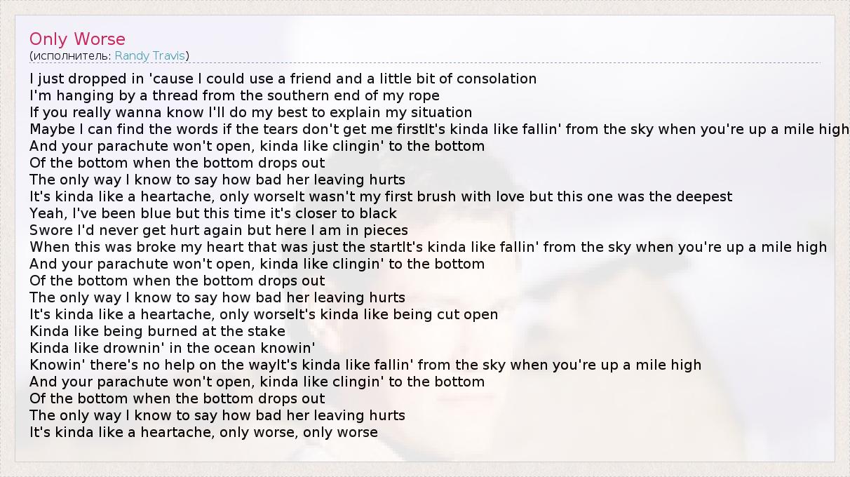 Это интересно:Если говорить о Рэнди Трэвисе коротко, то можно сказать, что он – один из величайших кантри-исполнителей в истории. Его первые шесть альбомов, выпущенные в период с 1986-го по 1991-й, в общей сложности, разошлись тиражом в 15 миллионов копий. Он входит в число 13 величайших кантри-исполнителей мира. Пятнадцать его песен достигали вершин всех главным кантри-чартов Америки. На его счету множество... продолжение