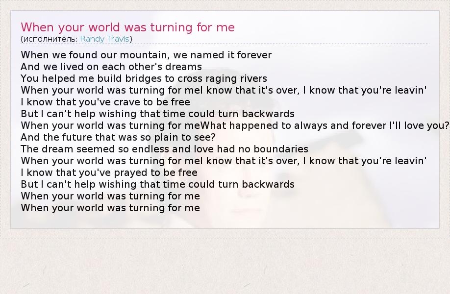 When we found our mountain, we named it forever And we lived on each other's dreams You helped me build bridges to cross raging rivers When your world was turning for meI know that it's over, I know that you're leavin' I know that you've crave to be free But I can't help wishing that time could turn backwards When your world was turning for meWhat happened to always and forever I'll love you? And the future that was so plain to see? The dream seemed so endless and love had no boundaries When your world was turning for meI know that it's over, I know that you're leavin' I know that you've prayed to be free But I can't help wishing that time could turn backwards When your world was turning for me When your world was turning for me