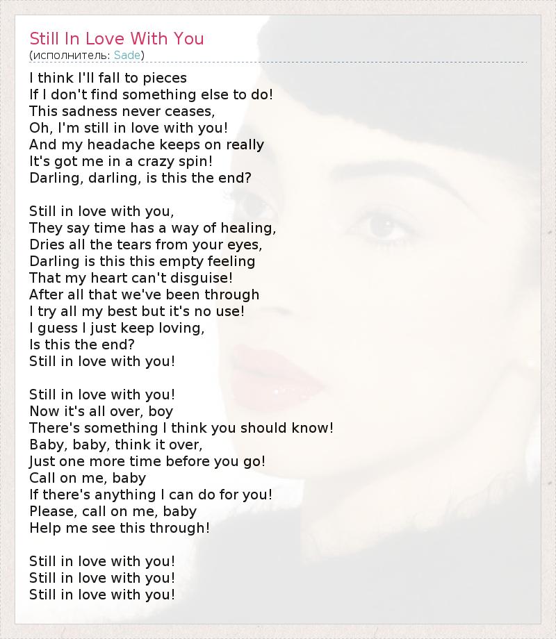 Мне кажется, я разобьюсь на осколки, Если не найду дела для себя. Эта печаль никогда не пройдет, О, я все еще влюблена в тебя! Моя головная боль не проходит, Всё идёт крýгом! Безумие! Дорогой, дорогой, неужели это конец? Все еще влюблена в тебя, Говорят, время лечит, Осушая слезы на глазах. Дорогой, неужели это бесполезное чувство, Что моё сердце не может утаить? После всего, что было между нами, Я пытаюсь делать все от меня зависящее, но толку никакого - Кажется, я продолжаю любить, Неужели это конец? Все еще влюблена в тебя! Все еще влюблена в тебя! Теперь все кончено, малыш, Есть кое-что, что тебе лучше знать, Малыш, малыш, думаю все кончено, В самый последний раз перед тем, как ты уйдешь, Позови меня, малыш! Если я что-то смогу сделать для тебя, Пожалуйста, позови меня, малыш, Помоги мне пережить это... Все еще влюблена в тебя! Все еще влюблена в тебя! Все еще влюблена в тебя!