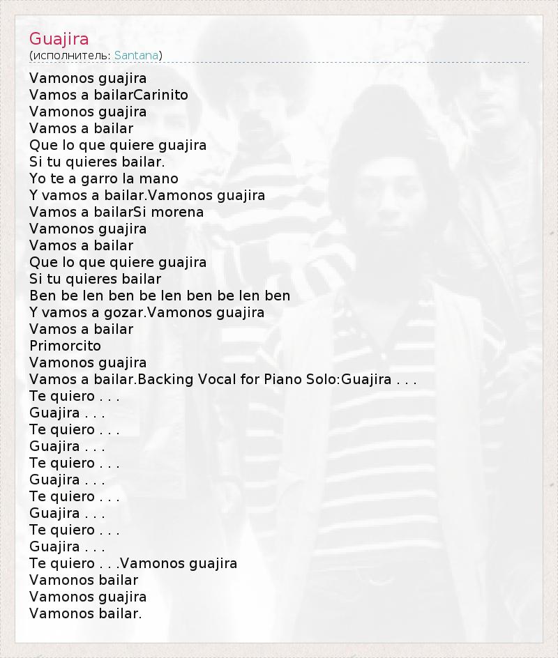 Vamonos guajira Vamos a bailarCarinito Vamonos guajira Vamos a bailar Que lo que quiere guajira Si tu quieres bailar. Yo te a garro la mano Y vamos a bailar.Vamonos guajira Vamos a bailarSi morena Vamonos guajira Vamos a bailar Que lo que quiere guajira Si tu quieres bailar Ben be len ben be len ben be len ben Y vamos a gozar.Vamonos guajira Vamos a bailar Primorcito Vamonos guajira Vamos a bailar.Backing Vocal for Piano Solo:Guajira . . . Te quiero . . . Guajira . . . Te quiero . . . Guajira . . . Te quiero . . . Guajira . . . Te quiero . . . Guajira . . . Te quiero . . . Guajira . . . Te quiero . . .Vamonos guajira Vamonos bailar Vamonos guajira Vamonos bailar.