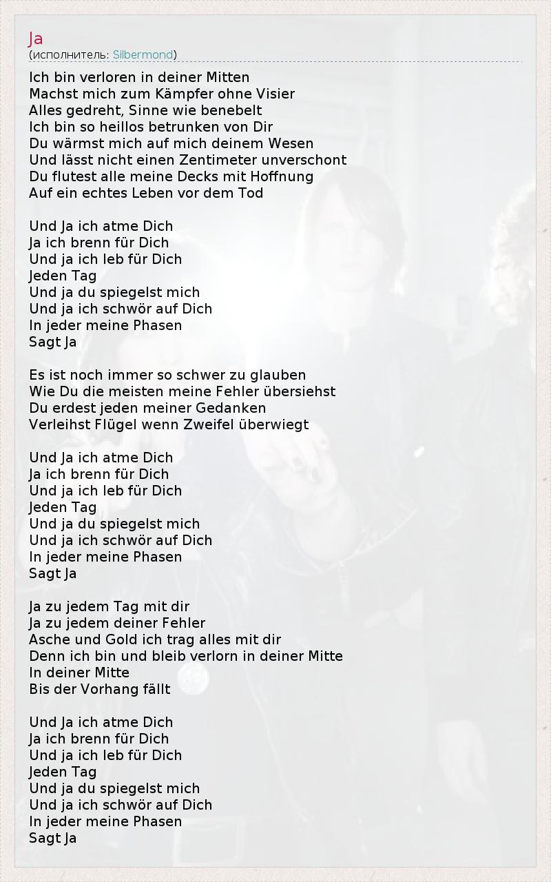 Ich bin verloren in deiner Mitten Machst mich zum Kämpfer ohne Visier Alles gedreht, Sinne wie benebelt Ich bin so heillos betrunken von Dir Du wärmst mich auf mich deinem Wesen Und lässt nicht einen Zentimeter unverschont Du flutest alle meine Decks mit Hoffnung Auf ein echtes Leben vor dem Tod Und Ja ich atme Dich Ja ich brenn für Dich Und ja ich leb für Dich Jeden Tag Und ja du spiegelst mich Und ja ich schwör auf Dich In jeder meine Phasen Sagt Ja Es ist noch immer so schwer zu glauben Wie Du die meisten meine Fehler übersiehst Du erdest jeden meiner Gedanken Verleihst Flügel wenn Zweifel überwiegt Und Ja ich atme Dich Ja ich brenn für Dich Und ja ich leb für Dich Jeden Tag Und ja du spiegelst mich Und ja ich schwör auf Dich In jeder meine Phasen Sagt Ja Ja zu jedem Tag mit dir Ja zu jedem deiner Fehler Asche und Gold ich trag alles mit dir Denn ich bin und bleib verlorn in deiner Mitte In deiner Mitte Bis der Vorhang fällt Und Ja ich atme Dich Ja ich brenn für Dich Und ja ich leb für Dich Jeden Tag Und ja du spiegelst mich Und ja ich schwör auf Dich In jeder meine Phasen Sagt Ja