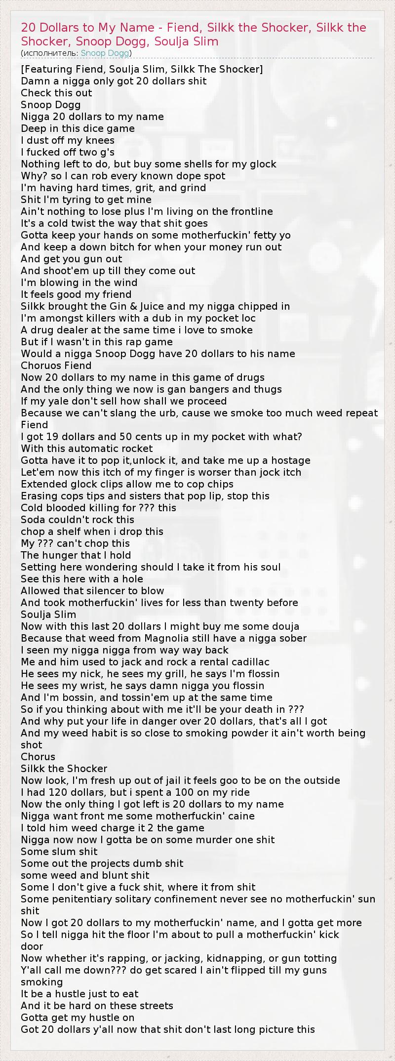 А как ты думаешь, о чем песня "20 Dollars to My Name - Fiend, Silkk the Shocker, Silkk the Shocker, Snoop Dogg, Soulja Slim" ?